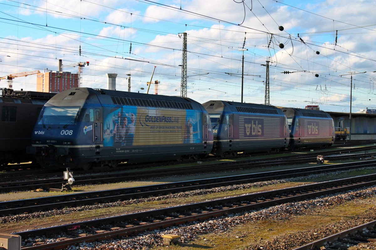 Am 11.02.2013 stand bei schönem Sonnenschein die BLS Cargo Loks Re 465 008-1 "GoldenPassLine" zusammen mit ihren Schwestern 465 014-9 und der Re 465 013-1 "Stockhorn" in Basel Bad Bf und warten auf ihre neuen Einsätze. Tobias Schmidt