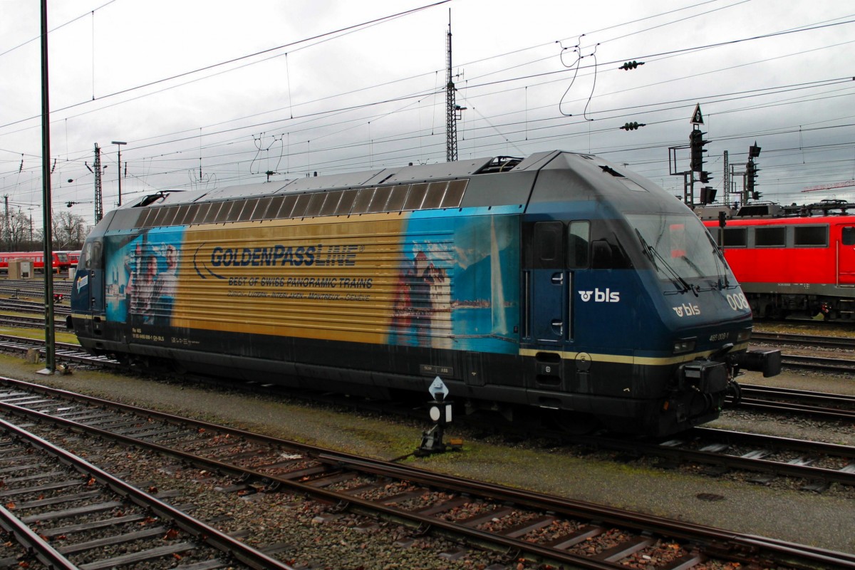 Lokportrait der BLS Cargo Re 465 008-1 "GoldenPassLine", als sie am 13.02.2014 bei starkem Wind und Regen in Basel Bad Bf in der BLS Abstellgruppe abgestellt war. Rechts im Hintergrund sind drei Lüfter Gitter der 140 537 zusehen, die an diesem Tag den Pbz aus Karlsruhe nach Basel brachte. Tobias Schmidt