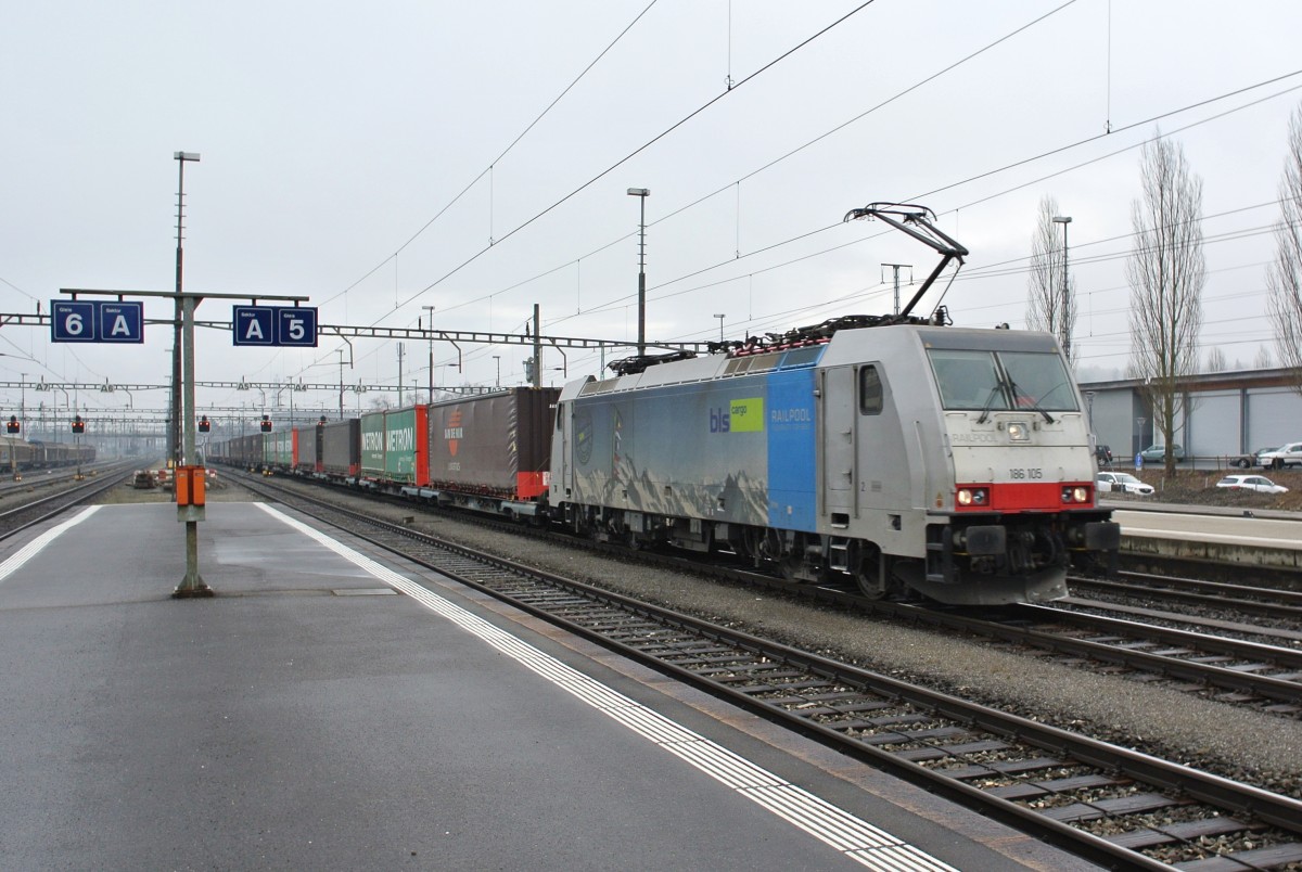 Hier ein BIld von von Railpool/BLS Cargo 186 105, die an diesem Tag den 42013 (Wanne-Eikel - Melzo) bespannt, und hier am 11.02.2014 in Basel Bad Bf durchfuhr. Tobias Schmidt