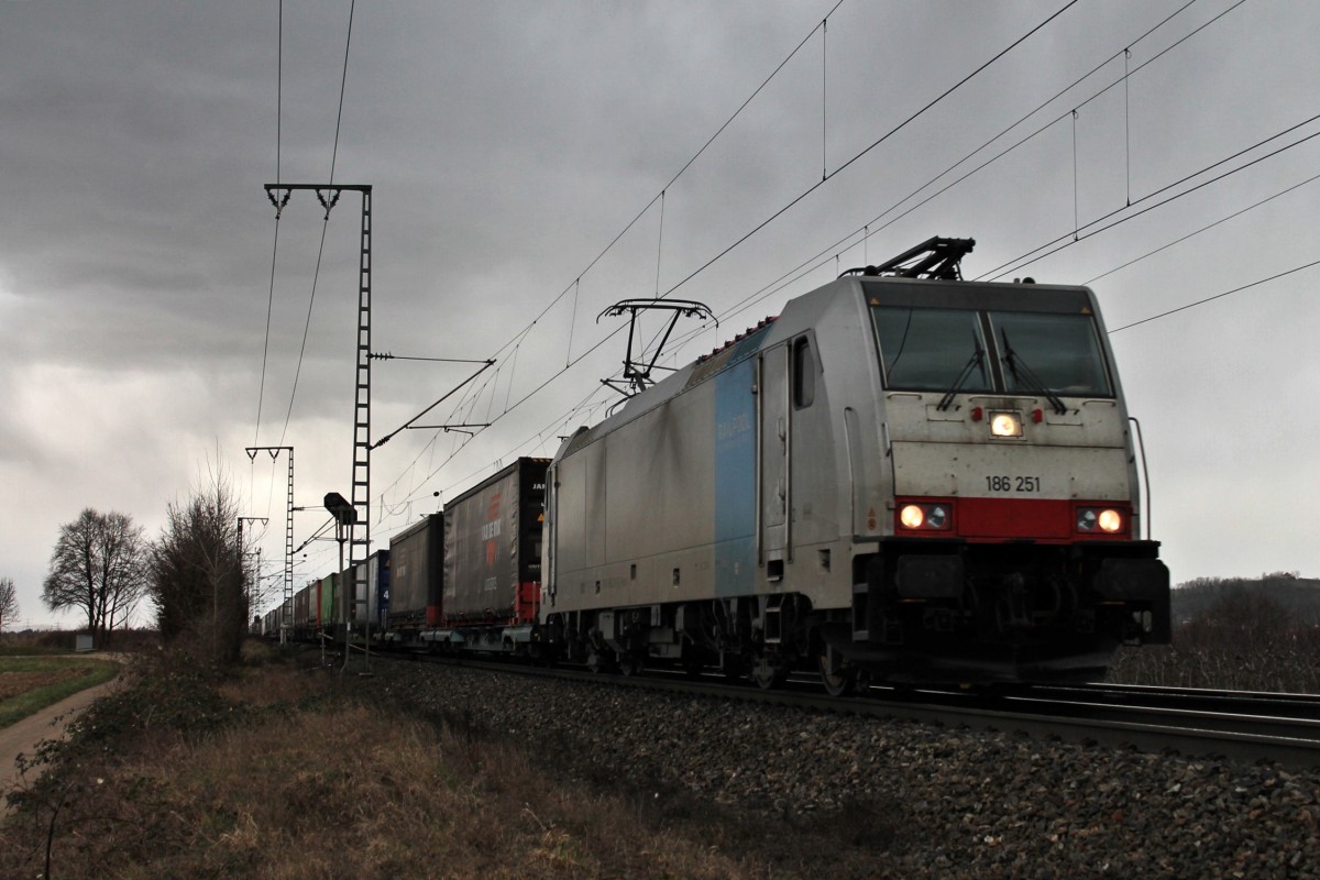 Railpool/Lokomotion/BLS Cargo 186 251 am 28.02.2014 mit dem 42013 aus Wanne-Eikel nach Melzo in Italien, bei der Einfahrt in den Bahnhofsbreich von Müllheim (Baden) gen Süden. Tobias Schmidt