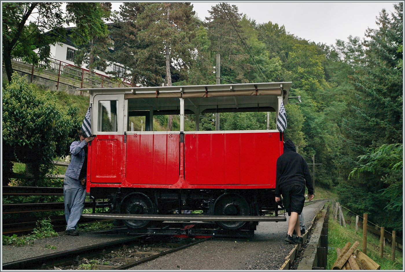 Das Zusammenbauen der Drehvorrichtung dauert etwa drei Minuten, dann fährt die Dm 2/2 vorsichtig darauf, wird fixiert und von vier Mitarbeiter gedreht. Anschliessend verlässt die Dm 2/2 N° 3 die Dreheinrichtung, die in gut zwei Minuten wieder auseinandergeschraubt und verstaut ist und die Fahrt, nun in der Gegenrichtung, weiter gehen kann.