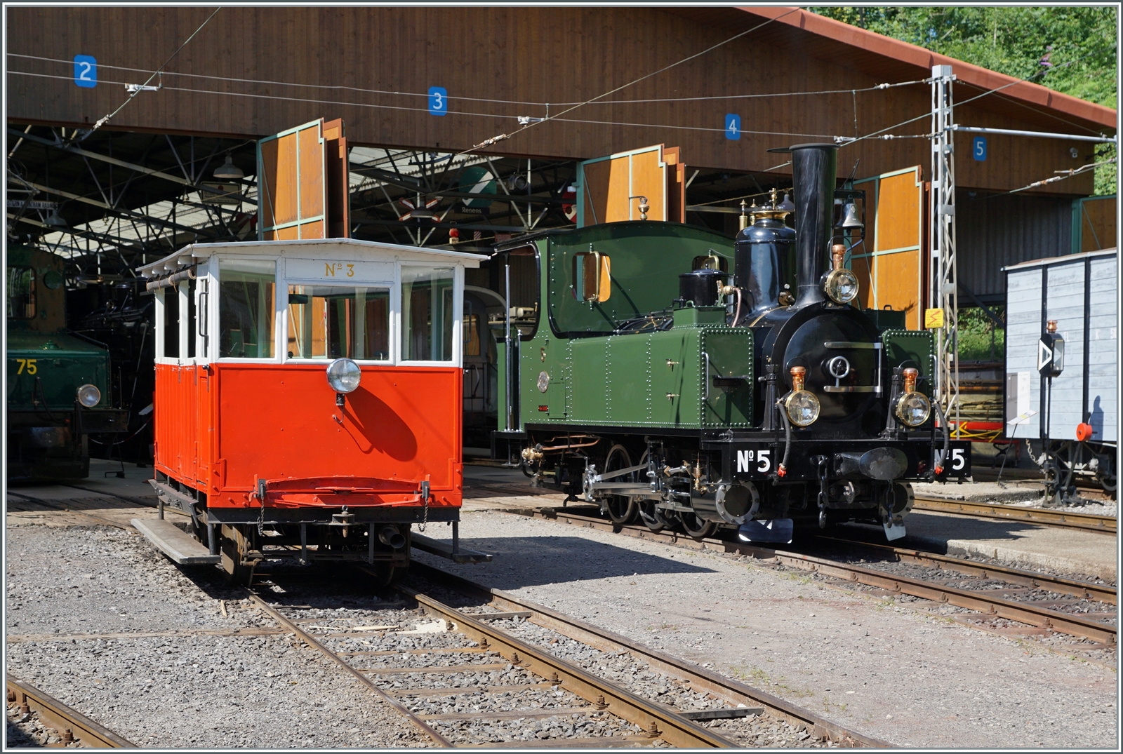 Selbst die zierliche LEB G 3/3 N° 5 von 1890 wirkt neben der winzigen Dm 2/2 N° 3 recht gross. Die Dm 2/2 N°3, die für das Bretonische Schmalspurnetz 1935 von Etablissements Billard gebaute Draisine nach der Ankunft ihrer Fahrt als Reisezug Chamby - Chaulin im Museumsbahnhof.