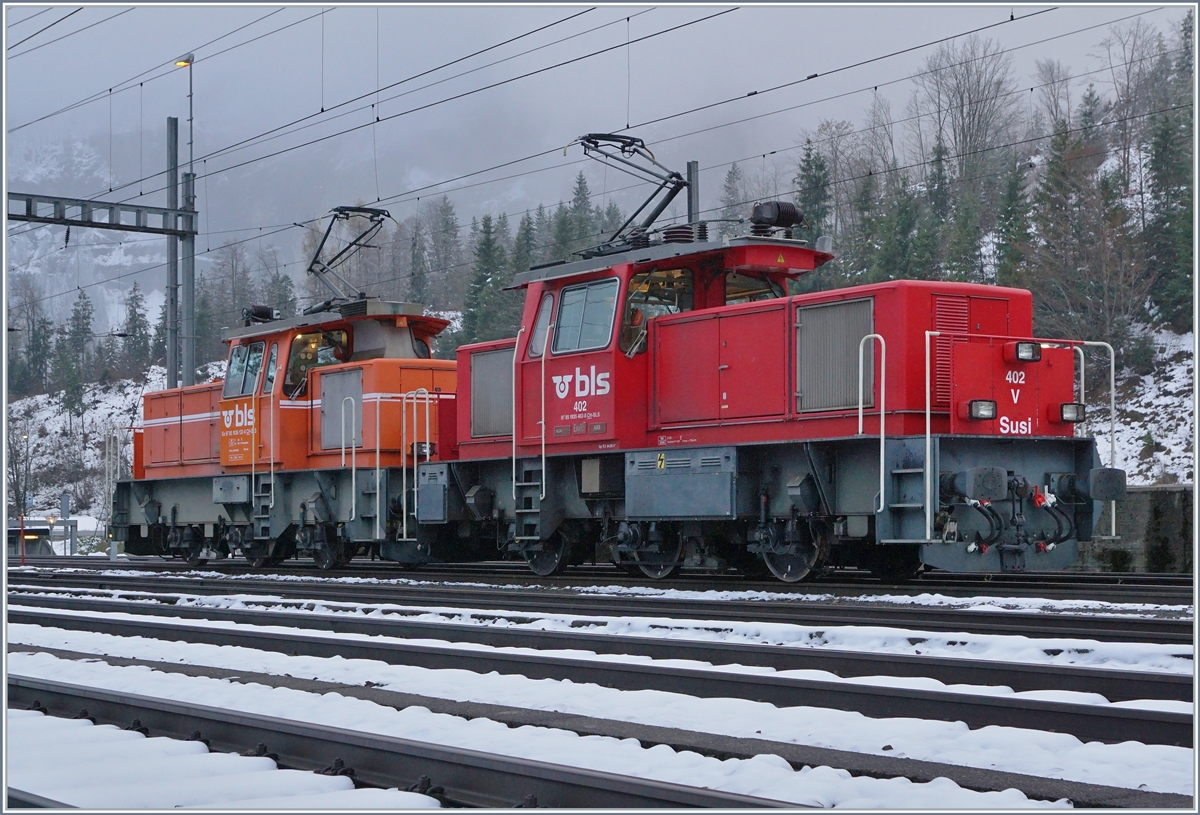 Gleich und doch nicht gleich, und dies nicht nur in farblicher Hinsicht: in Kandersteg warten die orange BLS Ee 3/3 132 (UIC Ee 97 85 1936 132-0 CH-BLS) und die rote BLS Eea 3/3 402 (UIC 97 85 1935 402-8 CH-BLS) "Susi" auf ihre nächsten Einsätze.