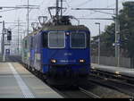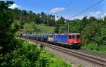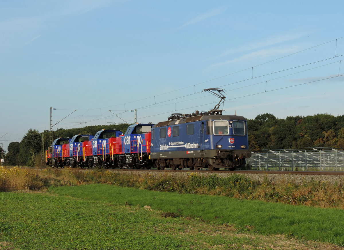 [Archiv] Am 19.09.2021 sind IRSI Re 421 387-2 und Rail Adventure Re 620 003-4 unterwegs mit einem leeren Zuckerrübenzug in Richtung Norden. Vermutlich wurden die Wagen auf Islikon überführt. Yannik Gartmann