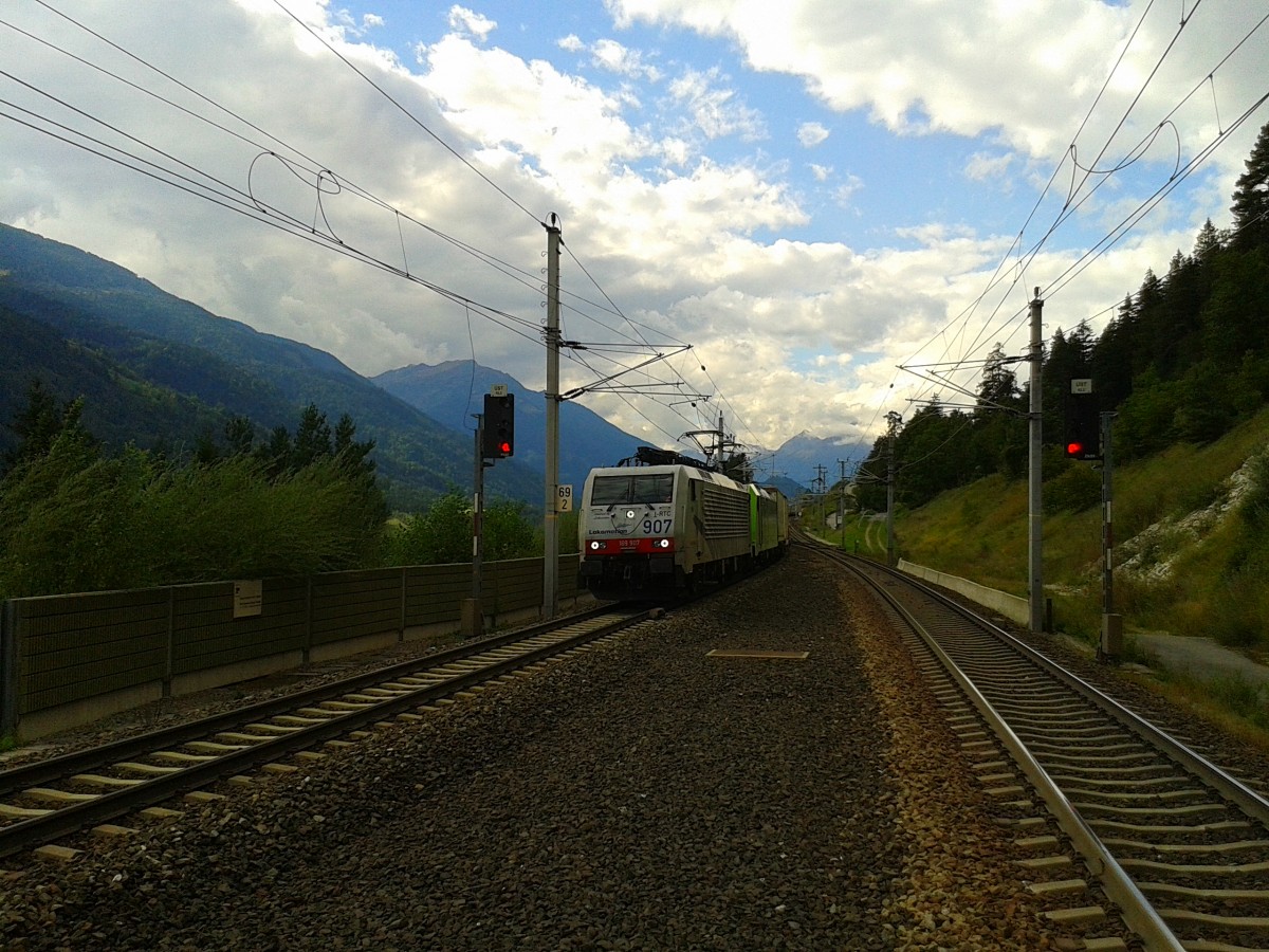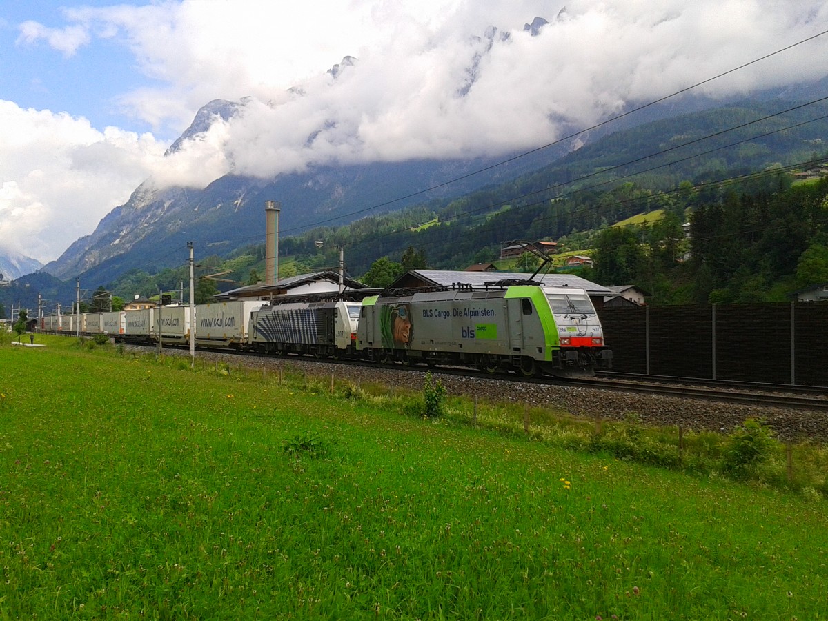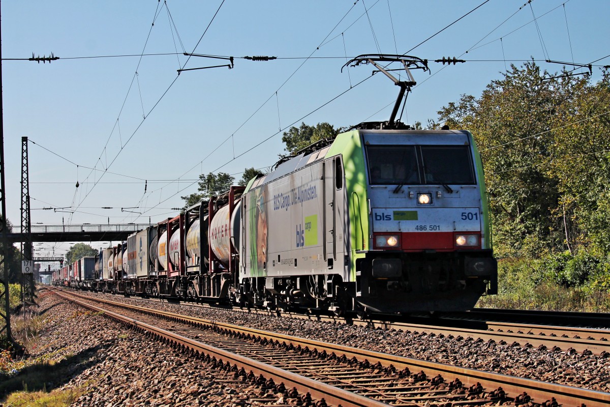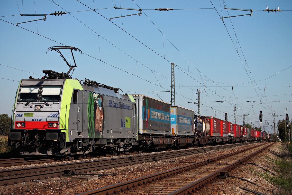 Bilder aus der March zwischen Pfäffikon SZ und Ziegelbrücke. BLS 486 508 mit einem langen Containerzug zwischen Siebnen-Wangen und Schübelbach-Buttikon. (24.09.2015) Herbert Graf