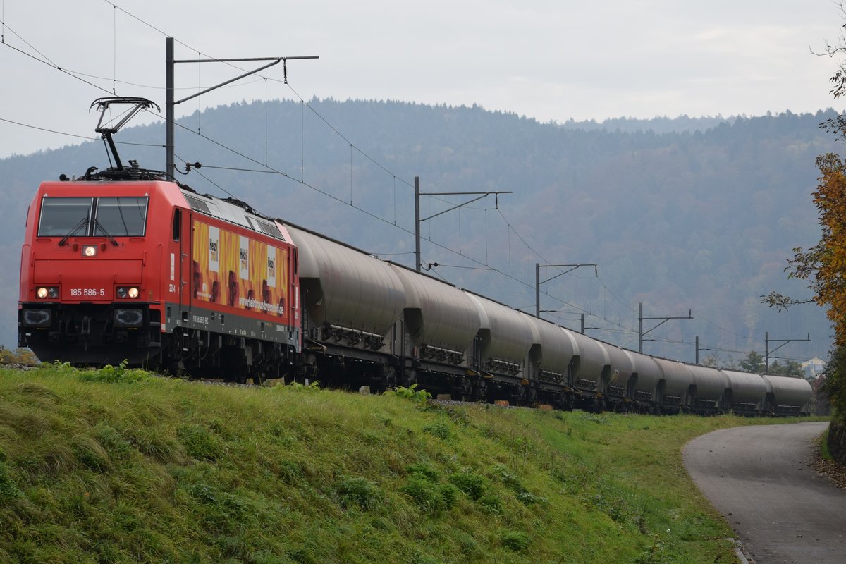 BR 185 586-5 der HGK wartet am 19.10.2017 vor Laufenburg (Schweiz) vor dem Halt zeigenden Signal auf die Einfahrt in den Bahnhof.