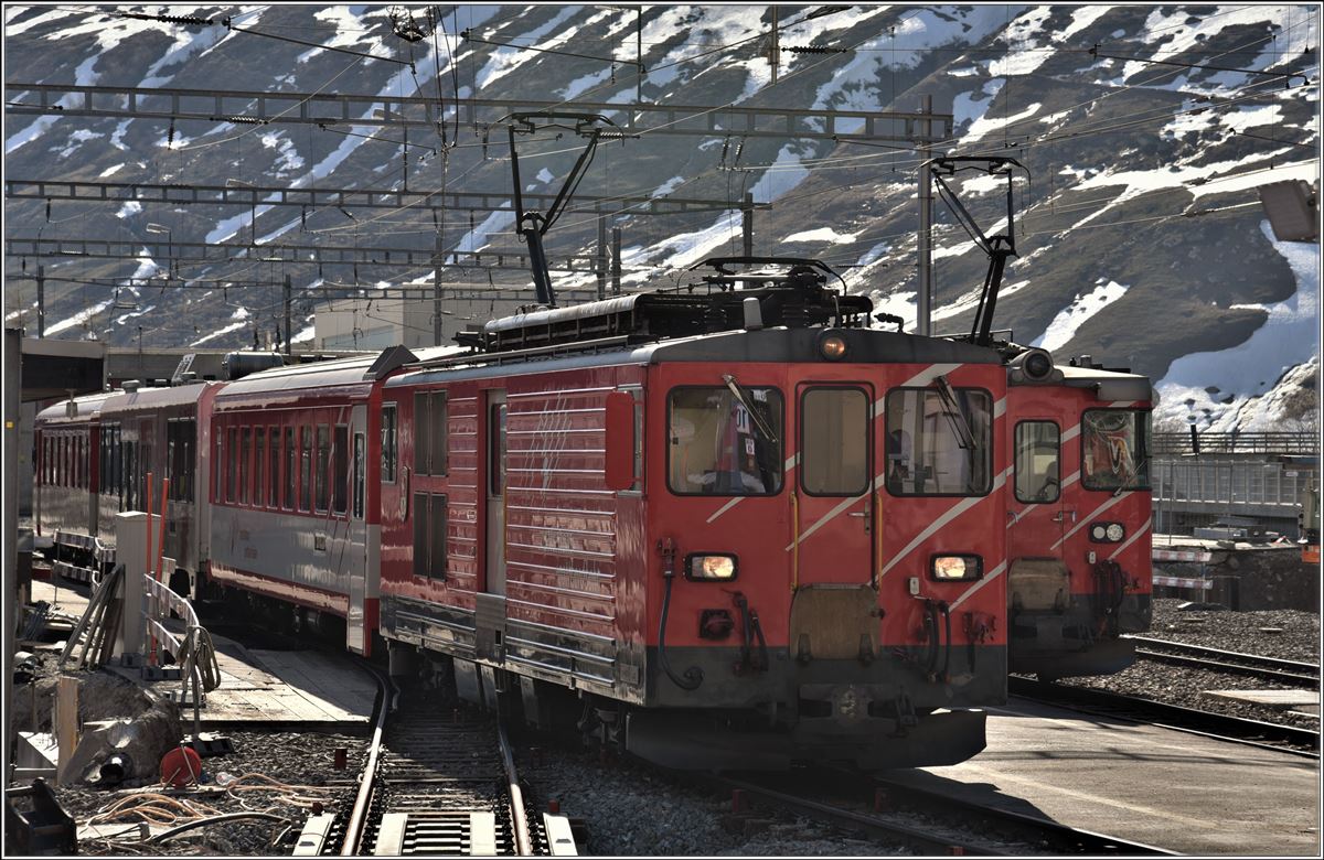 Ein Standart "Gommer-Pendel" der MGB am 10.6.18 auf dem Bahnhofplatz Brig mit der Deh 4/4 55 "Brig-Glis am Zugschluss, der auf die Abfahrt wartet. Stefan H.