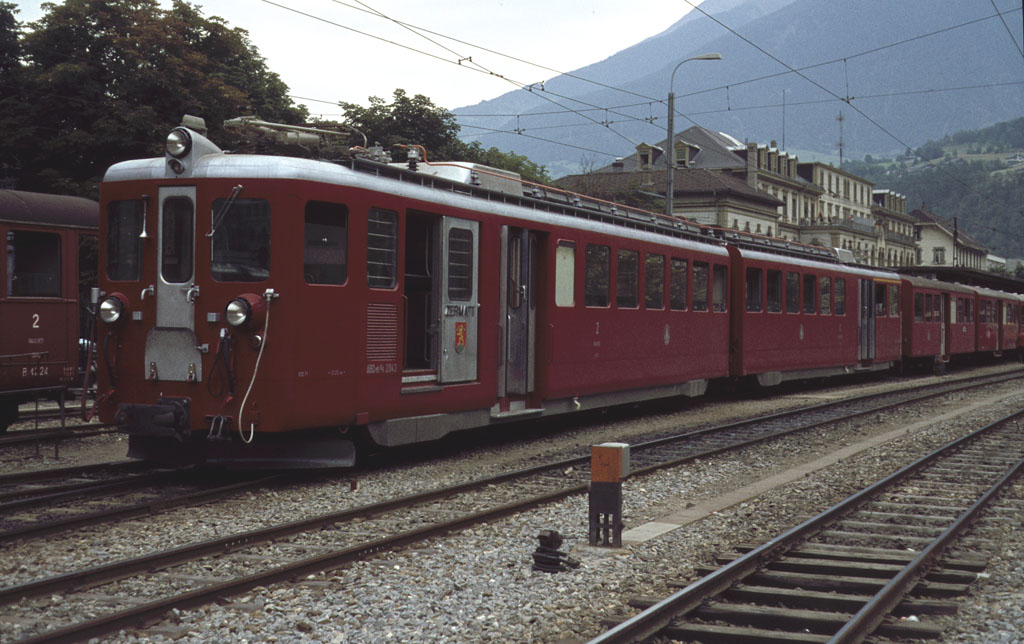 Auf den ersten Blick hat sich in den 44 Jahren, die zwischen den beiden Aufnahmen liegen, nicht allzuviel auf dem Bahnhofsvorplatz von Brig geändert. Noch immer nehmen hier die Züge nach Zermatt bzw. in Richtung Andermatt/Disentis ihren Anfang, allerdings fusionierten die frühere Furka-Oberalp-Bahn (FO) und Brig-Visp-Zermatt-Bahn (BVZ) im Jahre 2003 zur Matterhorn-Gotthard-Bahn. Damit änderten sich nicht nur die Aufschriften auf den Fahrzeugen, sondern auch die Farbgebung. Oben steht im Mai 1980 ein Deh 4/4 der BVZ mit einem Zug nach Zermatt abfahrbereit am Bahnsteig, darunter kommt der ABDeh 4/10 2012 auf der 2007 fertiggestellten Neubaustrecke mit dem RE 42 (Fiesch - Zermatt) am 08.05.2024 in Brig an. Horst Lüdicke