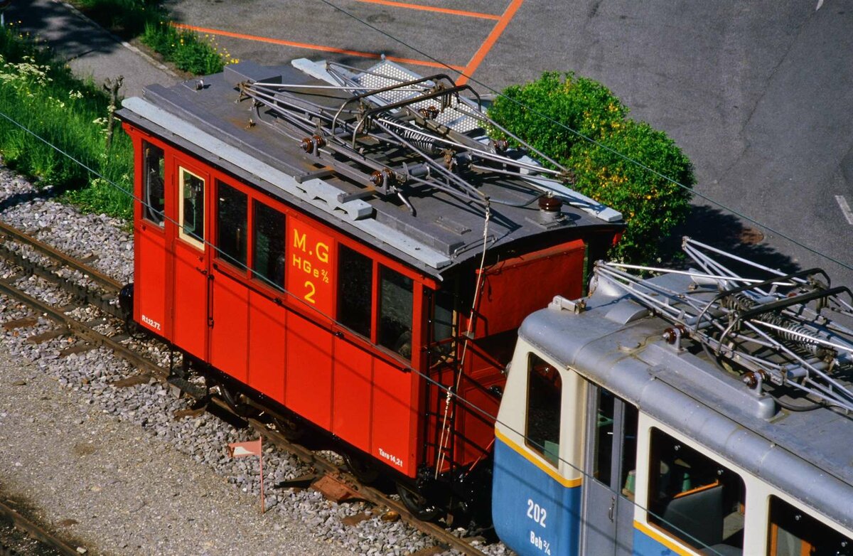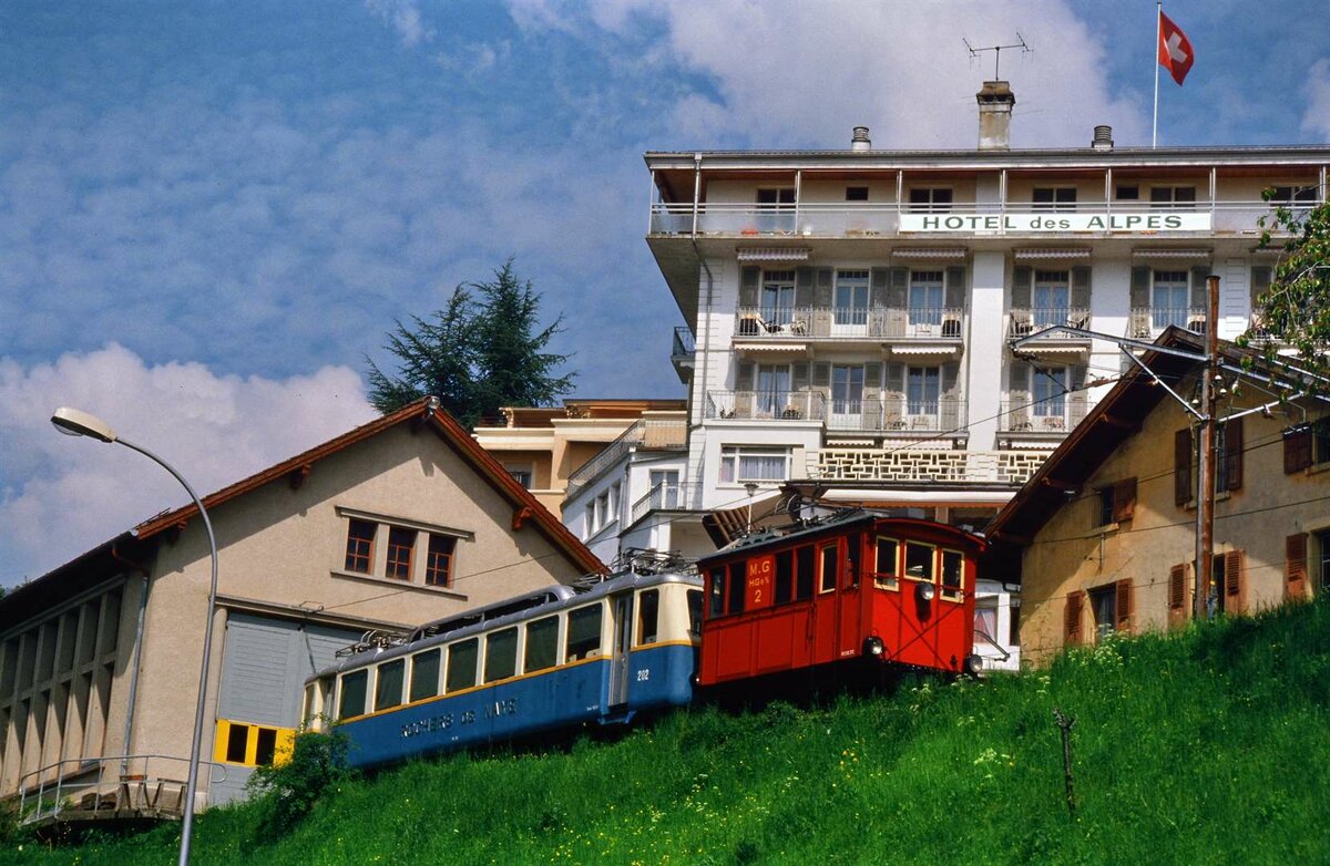 Glion: Vom Hotelzimmer aus fotografierte ich Zahnradlok HGe 2/2 Nr.2, welche zu diesem Zeitpunkt schön wiederhergerichtet war. Und auch Bhe 2/4 202 war ein Wagen aus dem Bestand der Schweizer Privatbahn MGN.