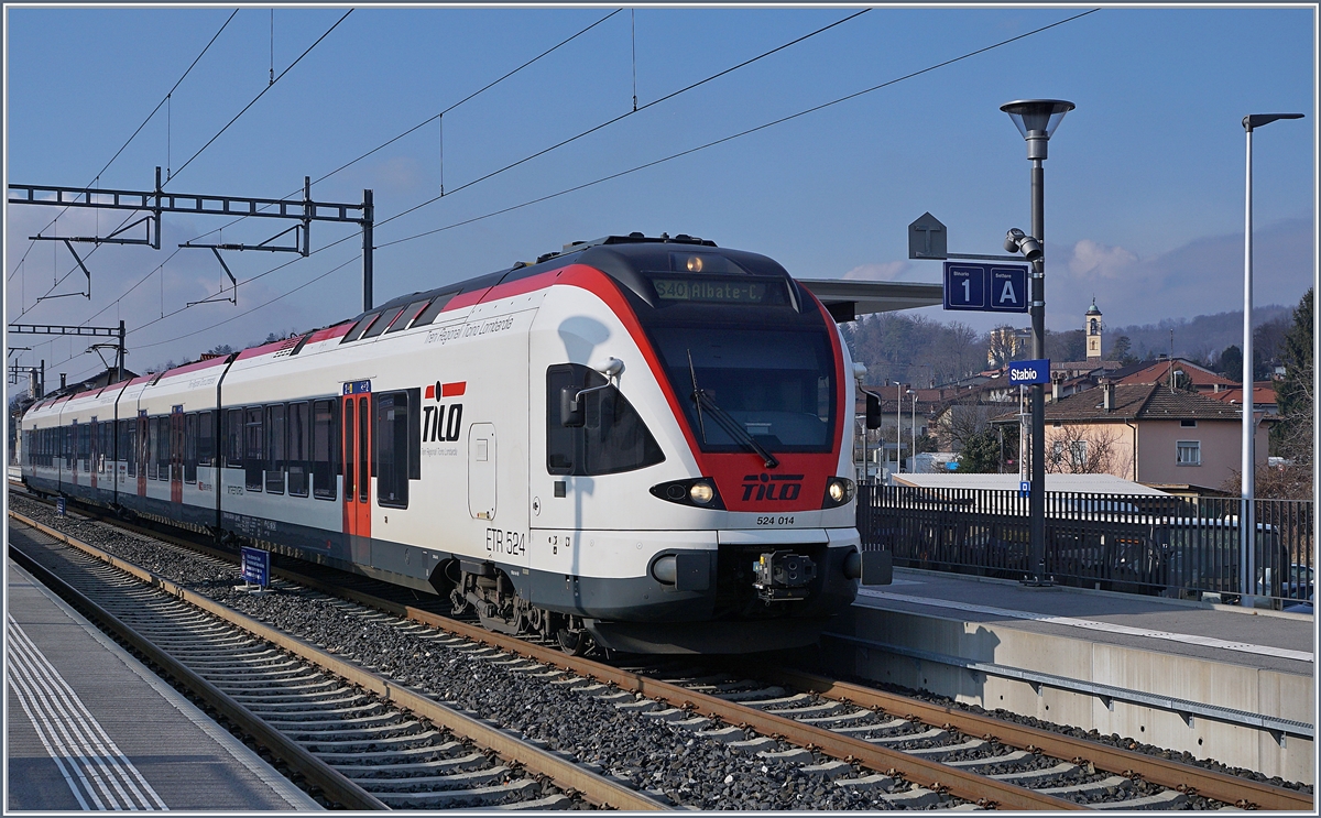 Bunte Bahnwelt im Tessin / Ticino: Stabio liegt an der Strecke Mendrisio - Varese und ist die letzte Station in der Schweiz. Es war nicht einfach, den Tilo RABe 524 014 im neu gestaltenten Bahnhof mit dem typischen Kirchturm der Region auf dieses Bild zu bekommen.