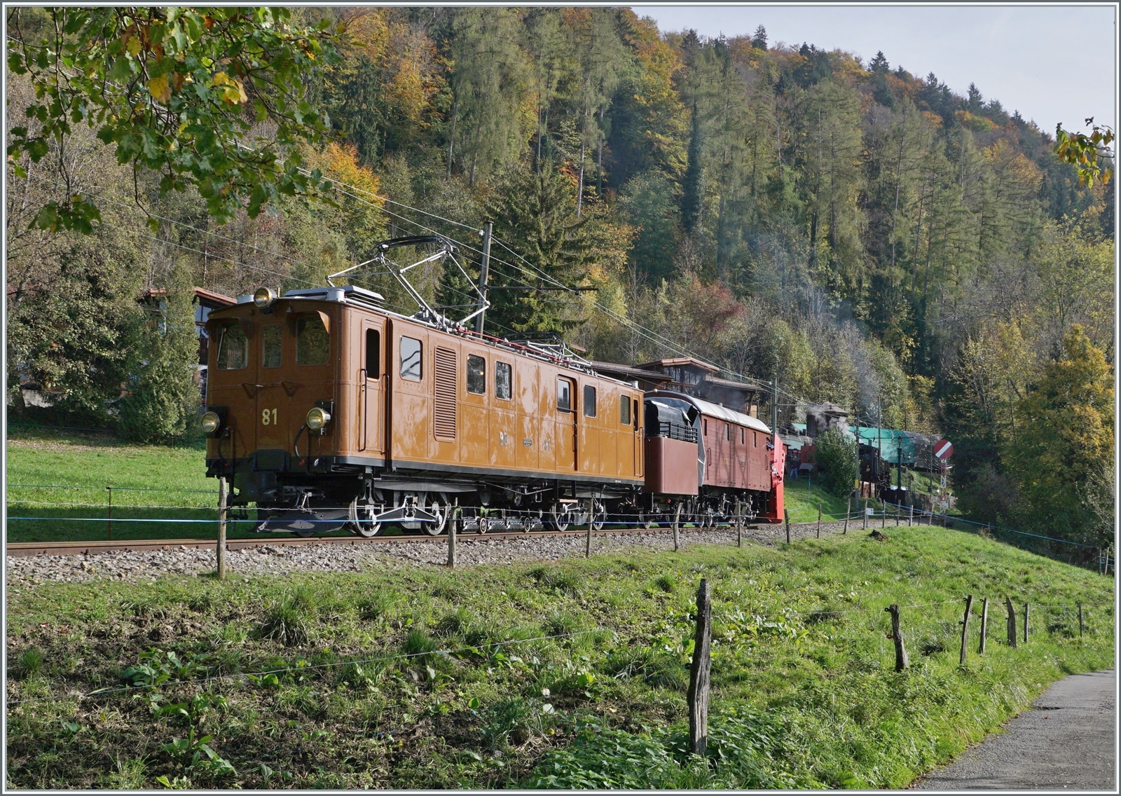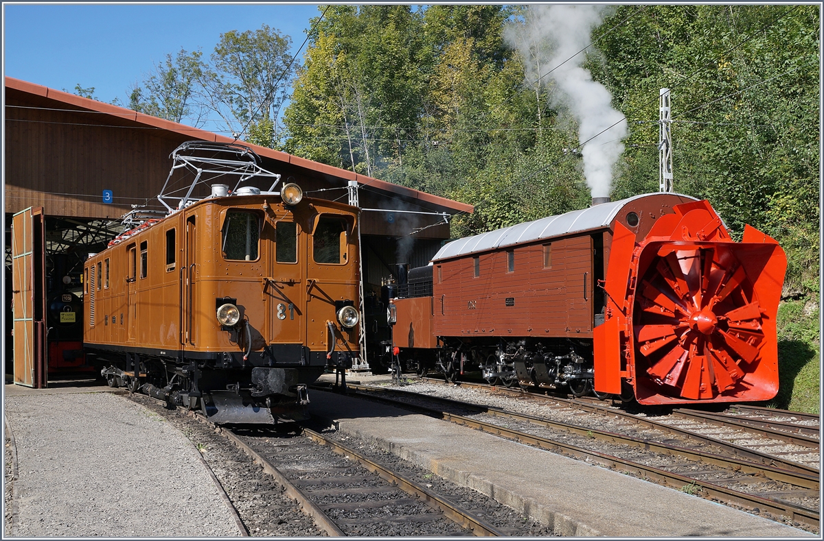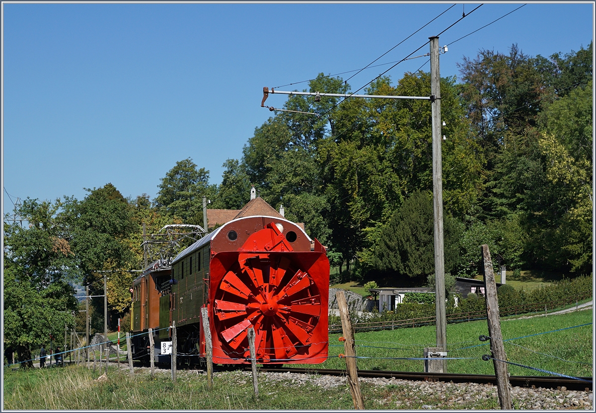 50 Jahre Blonay Chamby - MEGA BERNINA FESTIVAL: Das "Alignement" in seiner Gesamtheit genial, hat aber auf zwei Loks beschränkt auch seine Reize: Die Bahn Bernina Bahn Ge 4/4 81 der Blonay Chamby Bahn und die Bernina Bahn Dampfschneeschleuder mit ihrem mächtigen Schaufelrad, ebenfalls Blonay Chamby Bahn in Chaulin.