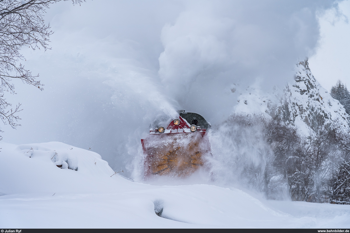 Rechts ein weiteres Relikt der Berninabahn, die Selbstfahrende Dampfschneeschleuder R 1052 (ex BB R 1052 (Berninabahn), ex RhB R 14, ex RhB Xrot d 9214), der Museumsbahn Blonay-Chamby. Dieses Fahrzeug wie auch das heute noch bei der RhB betriebsfähige Schwesterfahrzeug Xrot d 9213 (ex BB R 1051) sind dampfgetriebene Schneeschleudern mit eigenem Antrieb die für die Berninabahn (BB) gebaut wurden, die seit 1944 zur Rhätischen Bahn gehört. Im Gegensatz zu den bisher gebauten Fahrzeugen, auch der zwei Dampfschleudern der RhB-Stammstrecke, handelt es sich bei den beiden Bernina-Schleudern um selbstfahrende Fahrzeuge. Die Berninabahn entschied sich hierzu, weil in den engen Kurven mit nicht genügend hoher Kraft geschoben werden konnte und die Bahn selbst keine Fahrdraht-unabhängigen Triebfahrzeuge besaß. Die Schleudern wurden dennoch normalerweise mit Schiebetriebfahrzeugen eingesetzt, damit die gesamte Kesselleistung für die Dampfmaschine des Schleuderrades zur Verfügung stand.