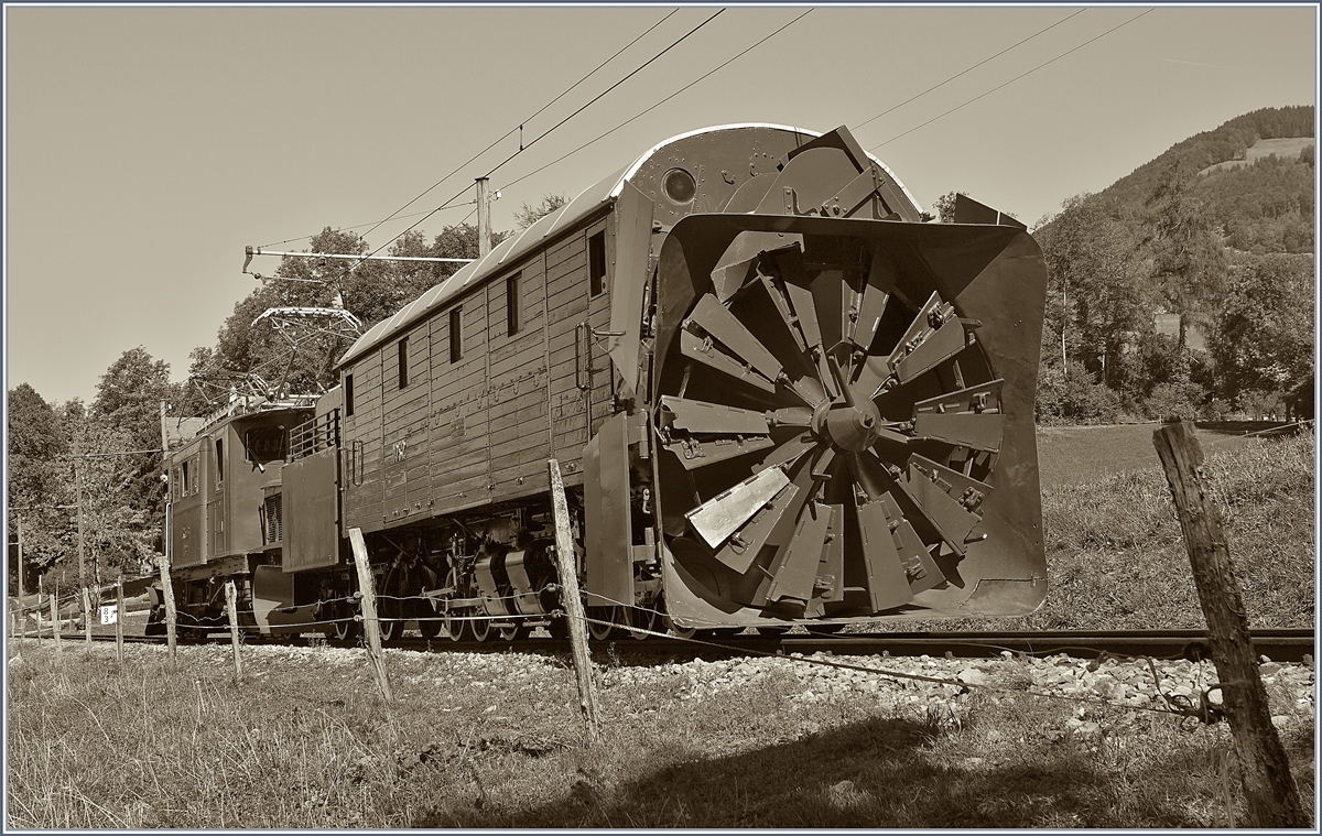 50 Jahre Blonay Chamby Bahn - Bernina Festival: auch wenn der Schnee fehlt, ist das Gespann der Rhb Bernina Ge 4/4 182 und der legendären Bernina Bahn Dampfschneeschleuder auf der "grünen Wiese" bei Chaulin sehr beeindruckend. Weitaus beeindruckender aber zeigt sich das Gespann im strengen Winterdienst im folgenden Video von 1937: