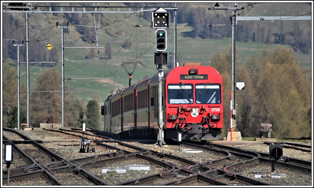 Fullhouse in Pontresina. R1932 nach Scuol-Tarasp mit Ge 4/4 II 630 "Trun". Dienstzug mit Ge 4/4 III 650 "Seewis-Valzeina", R4632 nach St.Moritz mit ABe 4/4 III 54 "Hakone" und ABe 8/12 3513 nach Campocologno. (06.05.2020) Herbert Graf