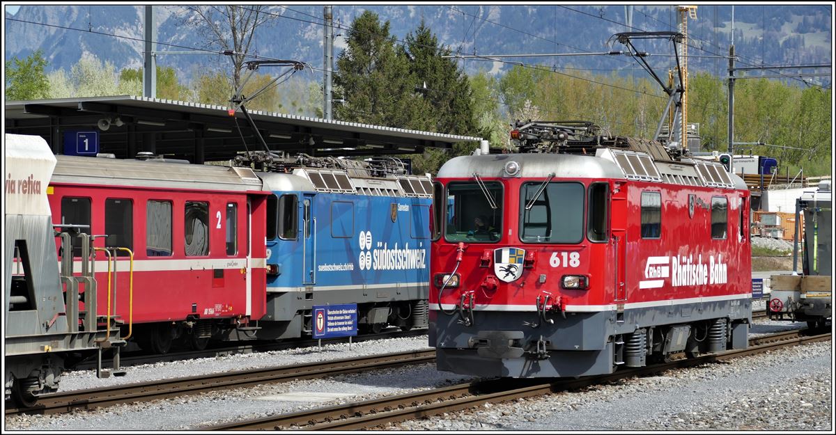 RE1728 nach Scuol-Tarasp mit Ge 4/4 II 619 "Samedan" und 5737 Ge 4/4 II 618 "Bergün/Bravuogn" holt Last für Ilanz in Untervaz-Trimmis. (16.04.2020) Herbert Graf