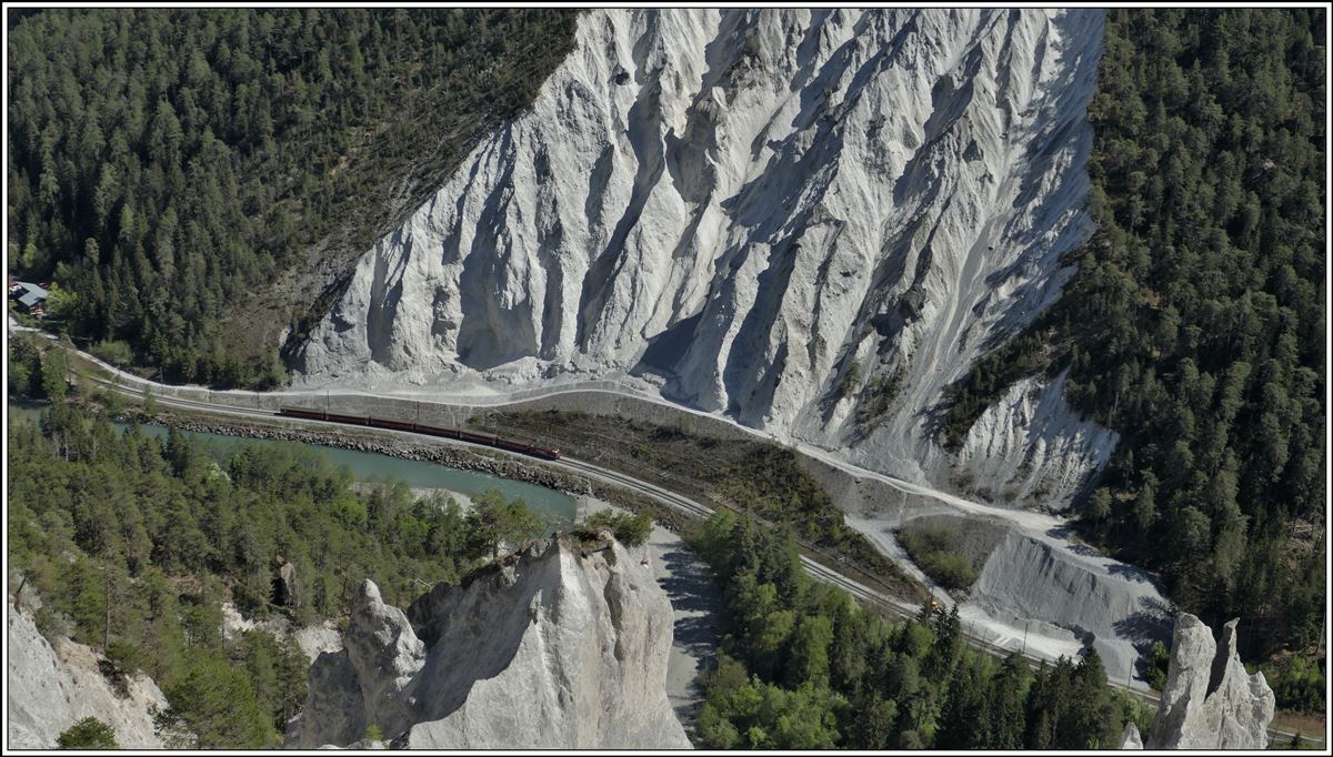 RE1744 mit Ge 4/4 II 622 "Arosa" im Gebiet des Flimser Bergsturzes, der sich hier vor fast 10000 Jahren ereignet hat.Links ist die Station Versam-Safien. (22.04.2020) Herbert Graf