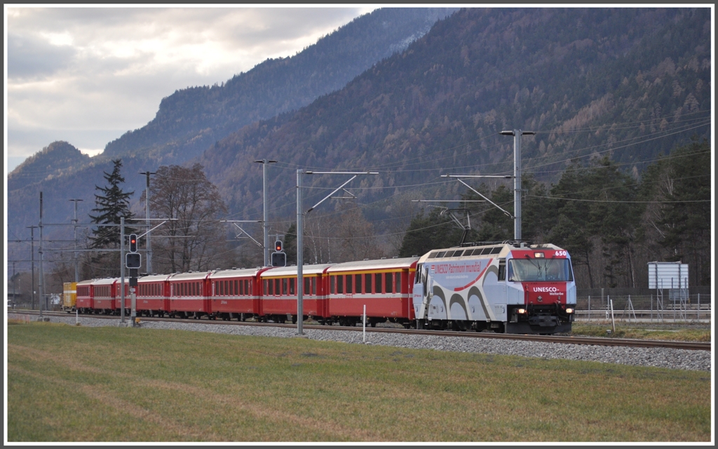 Die zwei weissen Ge 4/4 III 643 "Vals" und 649 "Lavin" mit den RE 1132 und 1129 begenen sich in Filisur. Die beiden grössten Firmen in Graubünden, die Ems Chemie und die Holcim, verwenden die gleiche Farbkombination rot/schwarz auf weiss. (10.10.2011) Herbert Graf