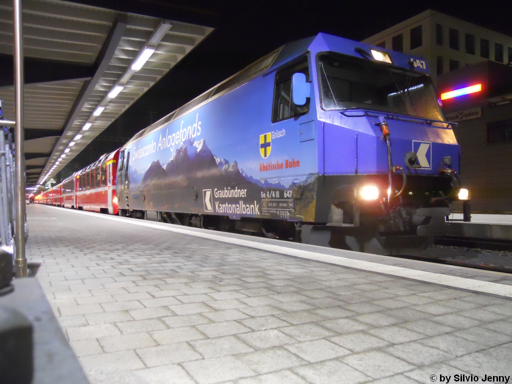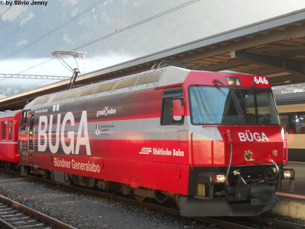 Ge 4/4''' 646 ''BÜGA'' am 15.1.2011 in Chur als RE 1129 nach St.Moritz. Wie jeder Tarifverbund haben auch die Bündner ein Verbundbilett, mit dem die meisten öffentlichen Verkehrsmittel mit nur einem Bilett benützt werden können, man nennt es schlicht ''Bündner Generalabonnement''. Wegen der eher problematisch einfallenden Januarsonne, musste ich mich für ei Lokportrait entscheiden. Silvio Jenny