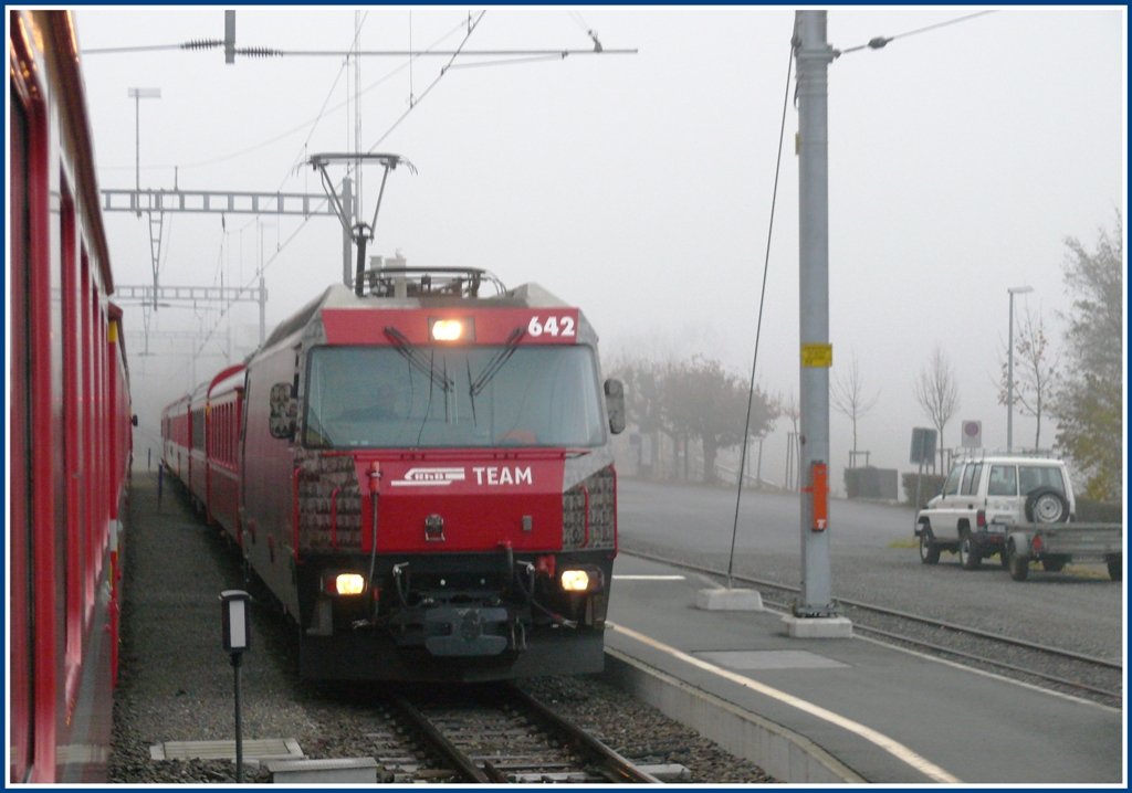 Während jenseits des Albulatunnels eitel Sonnenschein herrscht, ist es auf der Nordseite trüb und neblig. R1117 wird von der Ge 4/4 III 651 "Fideris" soeben auf den frisch renovierten Landwasserviadukt gezogen. (11.11.2009) Herbert Graf