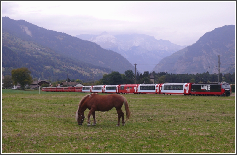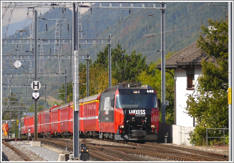Dem Regionalzug folgt der RE1141 nach St.Moritz mit Ge 4/4 III 646 "Sta.Maria/Val Müstair", die in eigener Sache das Bündner Generalabonnement bewirbt. (01.10.2009) Herbert Graf