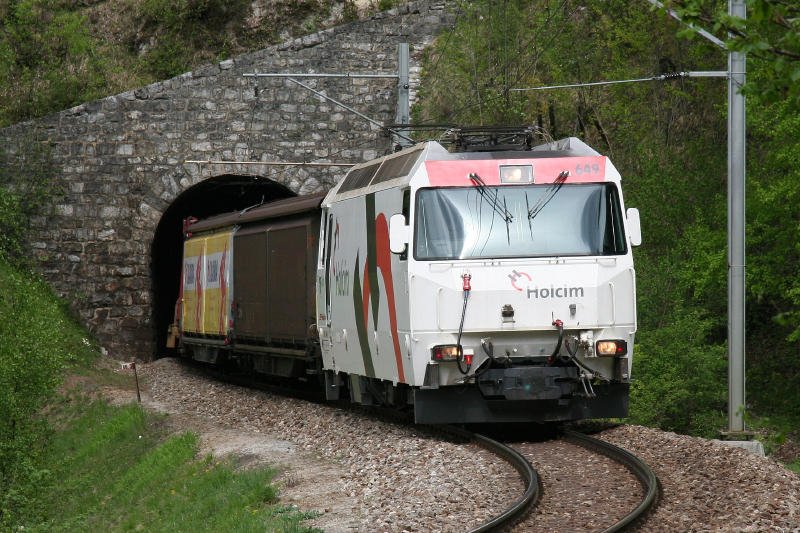 Ge 4/4 III 649 "Lavin" mit der Werbung für "Holcim" hat soeben den 55m langen Schlossbergtunnel unterhalb der Ruine Greifenstein durchfahren und strebt am 2.05.2007 dem Engadin entgegen. Andreas Preibisch