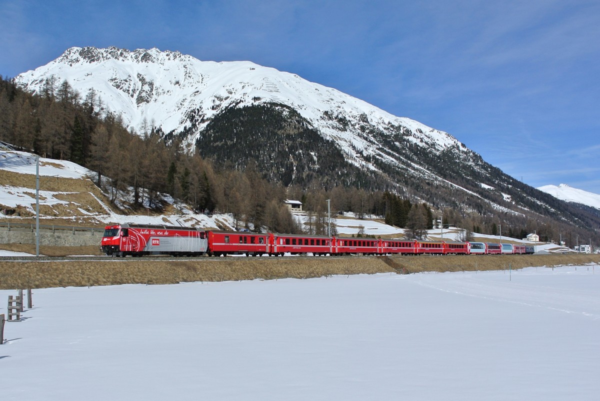 Vom Muottas Muragl aus lässt sich der Bahnverkehr im Dreieck St. Moritz - Pontresina - Samedan wunderbar beobachten. Am Abend des 10. Juli 2014 fährt der Glacier Express von Zermatt aus kommend gerade seinem Celerina entgegen, dem letzten Zwischenhalt vor seinem Ziel St. Moritz, welches er nach 7 1/2-stündiger Reise erreichen wird. Julian Ryf