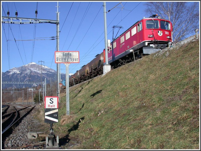 Ge 6/6 II 703 "St.Moritz" nähert sich mit einem Güterzug der Station Untervaz. Die Ende Schamalspurtafeln beziehen sich auf die links liegende Übergabegruooe der Holcim Zementwerke. (09.02.2007) Herbert Graf