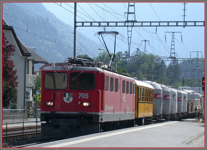 Ge 6/6 II 705 "Pontresina/Puntraschigna" mit einem Güterzug bei der Durchfahrt in Domat/Ems. Hinter der Lok ein historischer Berninabahn-Personenwagen. (01.05.2007) Herbert Graf