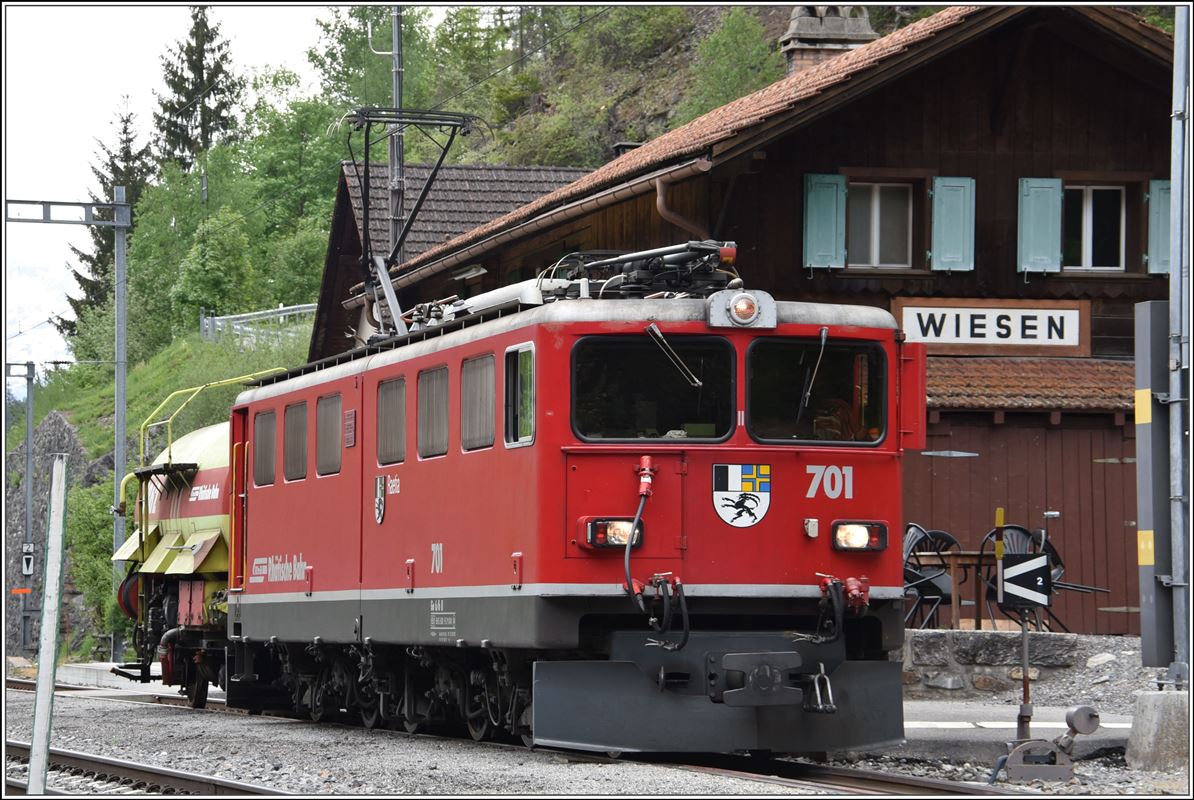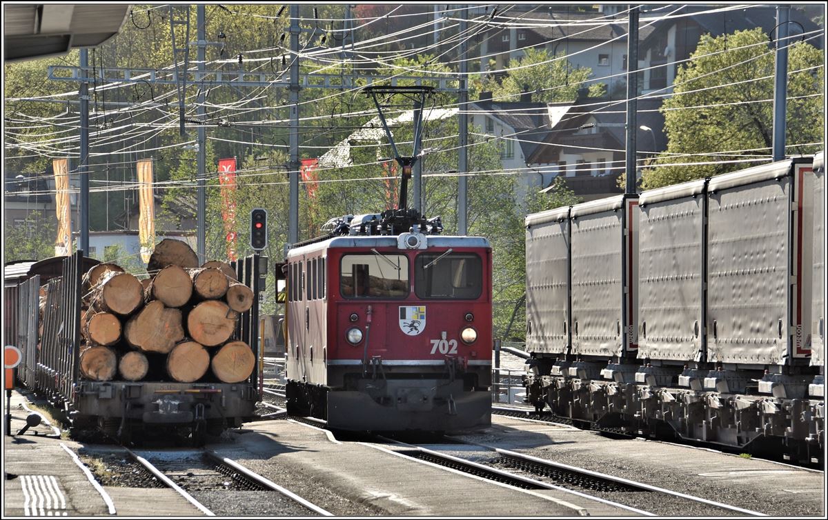 Ge 6/6 II 703 "St.Moritz" mit Valserwasser einerseits in RailCare Container zum Umlad auf die Normalspur in Felsberg und andererseits in den Schiebewandwagen zum Verteillager in Untervaz-Trimmis. (10.04.2018) Herbert Graf