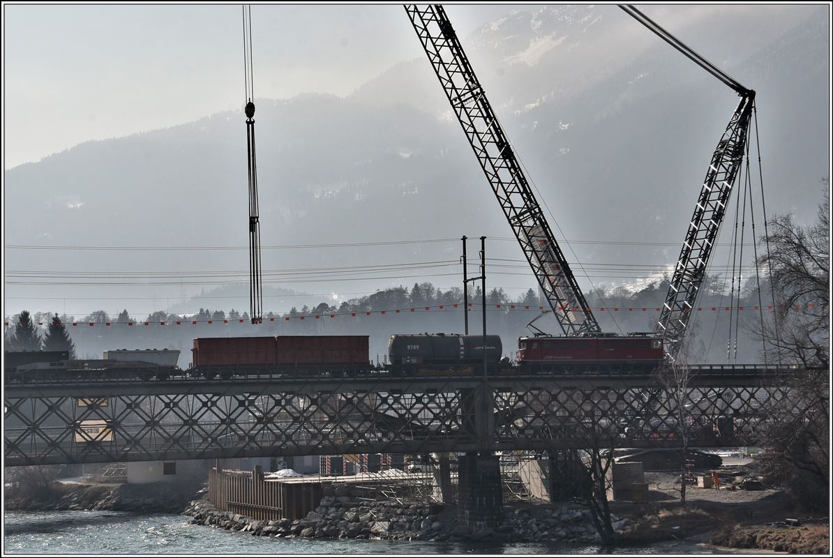 Bau 2.Hinterrheinbrücke RhB in Reichenau-Tamins. Einbau des Mittelteils. GmP4718 mit Post und Valserwasser wird von Ge 6/6 II 701 "Raetia" geführt. (09.03.2018) Herbert Graf