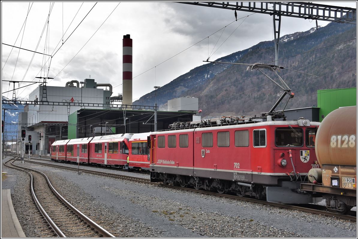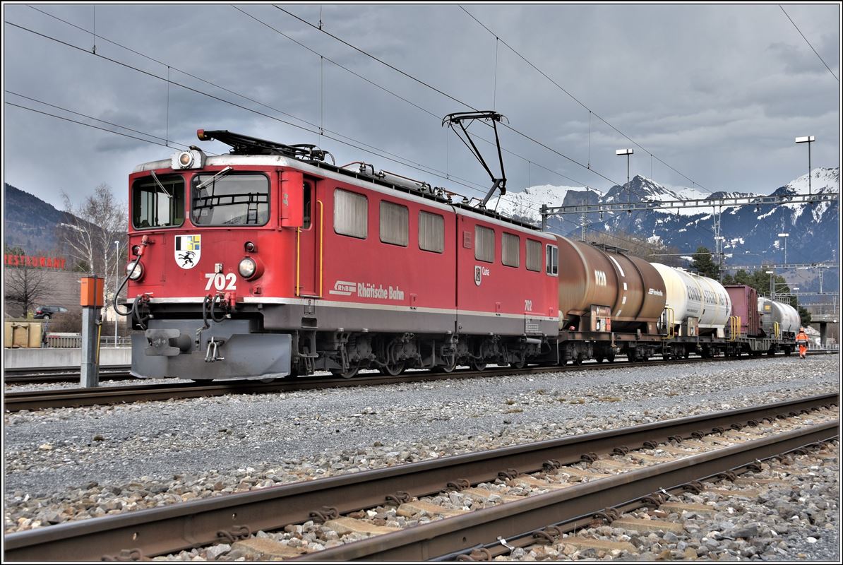 Ilanz ist ein bedeutender Güterbahnhof der RhB, vor allem für Valser Mineralwasser, Holz und Kehricht. Die Ge 6/6 II 705 "Pontresina/Puntraschigna" bringt leere Wagen aus Untervaz und nimmt volle Wagen zurück.(08.03.2018) Herbert Graf