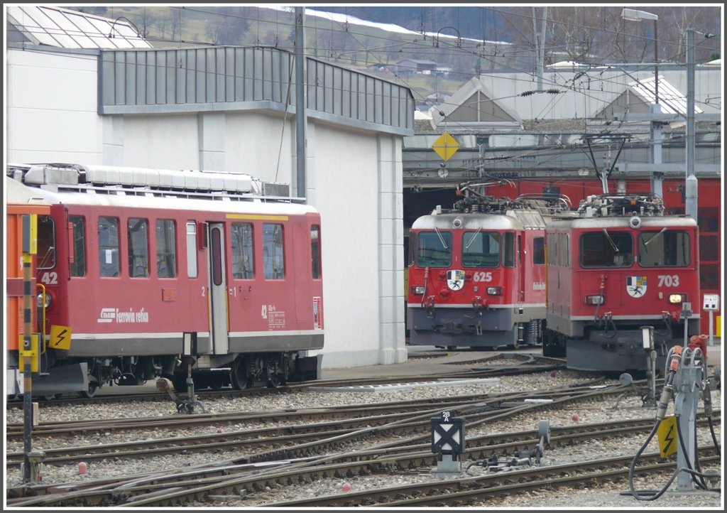 Bernina ABe 4/4 II 42 steht neben dem Depot, auf der Drehscheibe die Ge 4/4 II 625 "Küblis" und davor die Ge 6/6 II 703 "St.Moritz". (18.03.2010) Herbert Graf