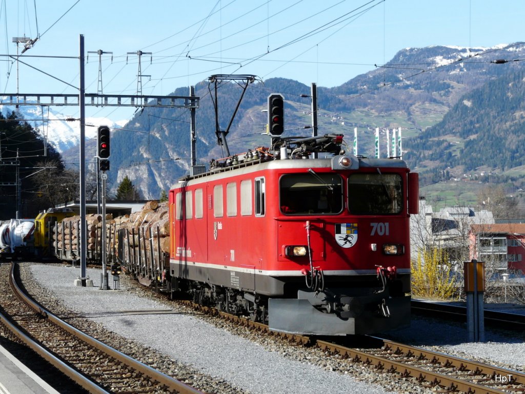 Die Ge 6/6 II 702 "Curia" zieht einen langen Güterzug Richtung Disentis. Diesen Sommer wird hier der durchgehende Wanderweg zwischen Trin Station und Reichenau-Tamins gebaut. Die Hängebrücke über den Vorderrhein bei der Station Trin ist bereits im Bau, sodass man neu auf die Bonaduzer Seite wechseln kann, was für Bahnfreunde unzählige neue Fotostandpunkte erschliessen wird. (28.04.2010) Herbert Graf