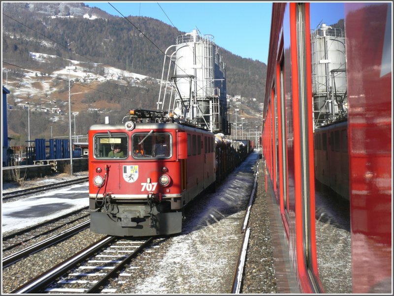 Während Ge 6/6 II 701 "Raetia" mit einem kurzen Güterzug in dern neuen Ausweiche Zizers auf einen Gegenzug wartet, prescht Re 460 031-8 mit einem IC nach Basel mit 140km/h vorbei. (27.12.2007) Herbert Graf