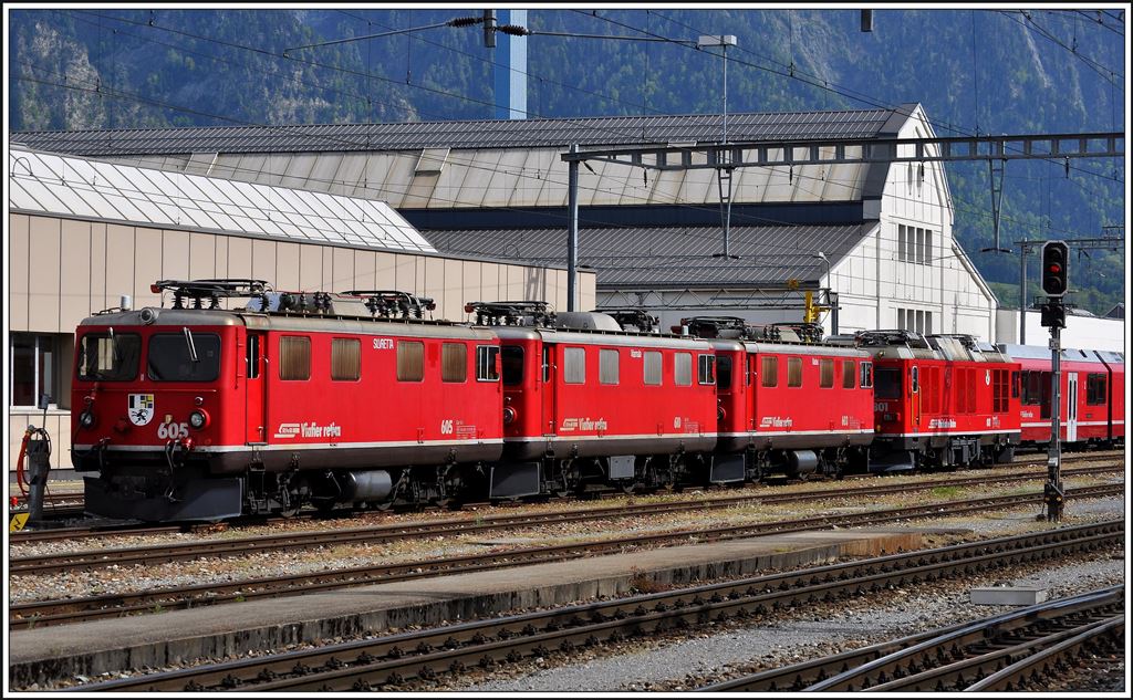 Alle drei Ge 4/4 I standen gestern beisammen in Landquart. Ge 4/4 I 605 "Silvretta", 610 "Viamala", 603 "Badus" und zusätzlich die Bernina Gem 4/4 801. (05.05.2014) Herbert Graf