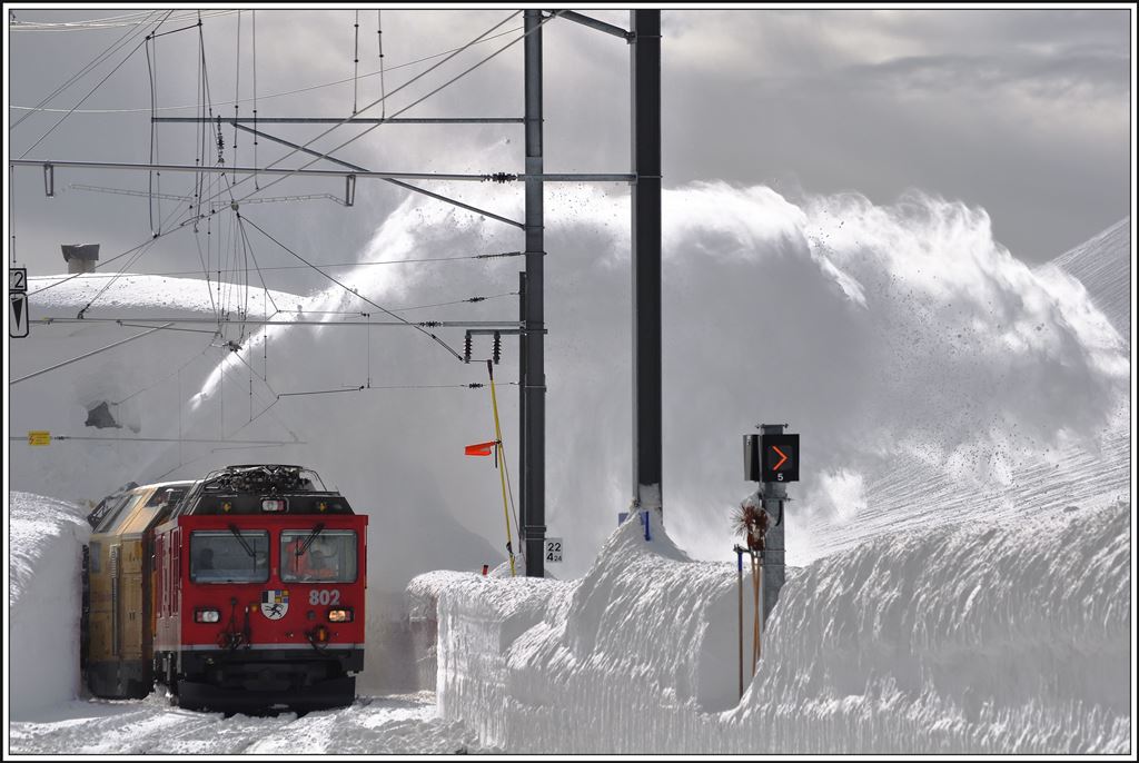 Die Berninabahn ist immer für eine Überraschung gut, wie heute mit der Schleuder Xrot mt 95403 (mit ihrer vollen Breite) zusammen mit der Gem 4/4 802 "Murmeltier". Ospizio Bernina, 14.02.2014 Reto Mäder