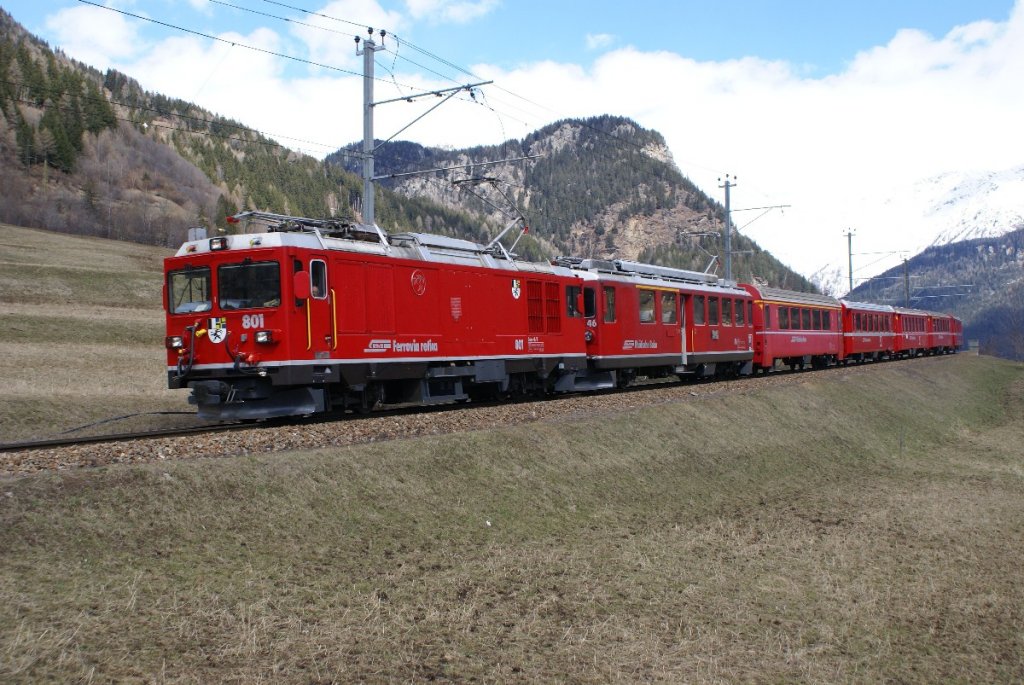 Die RhB Gem 4/4 801 und der ABe 4/4 II 44 sind mit einem Bernina Regionalzug auf dem Weg nach St. Moritz. Das Bild entstand beim Halt des Zuges in Morteratsch.