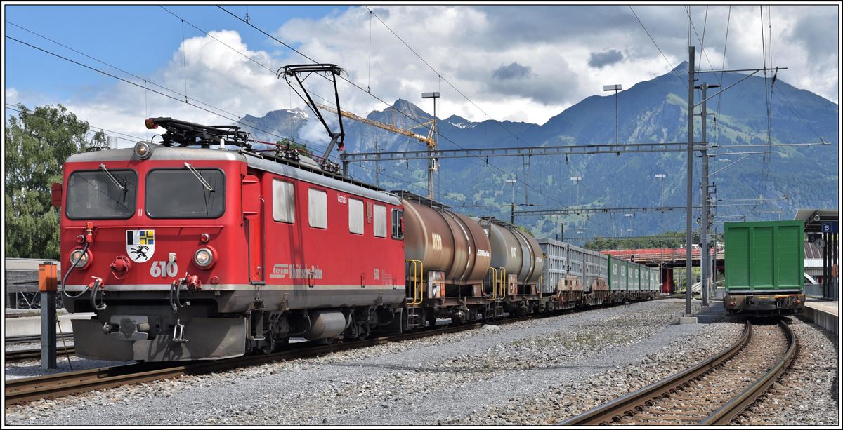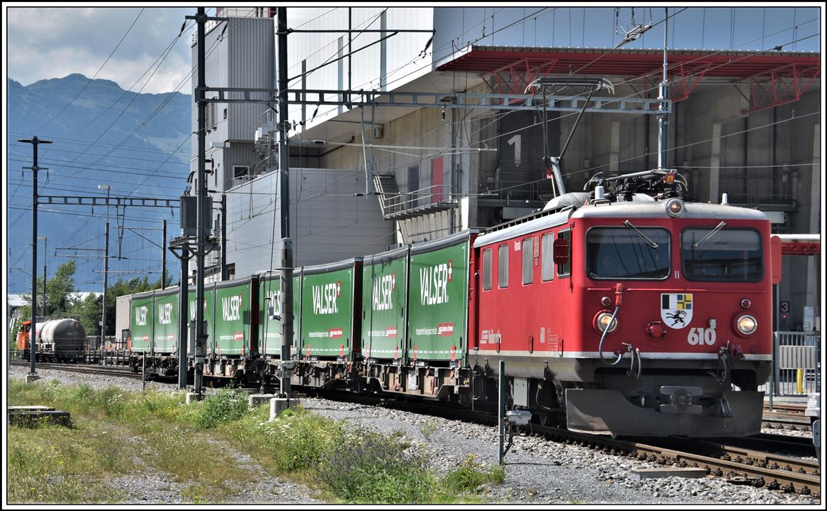 5732 aus Ilanz mit der Ge 4/4 I 610 "Viamala" trifft mit Valserwasser in Untervaz-Trimmis ein. (14.07.2020)