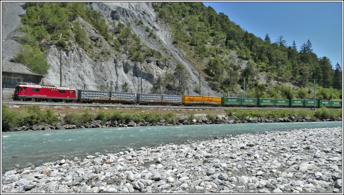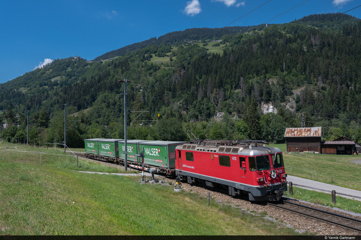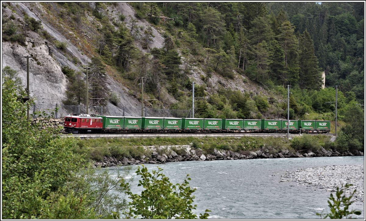 RhB Ge 4/4 II 912 "Thusis" am 27.07.2020 am Valser Wasser Güterzug kurz nach Ilanz aufgenommen.