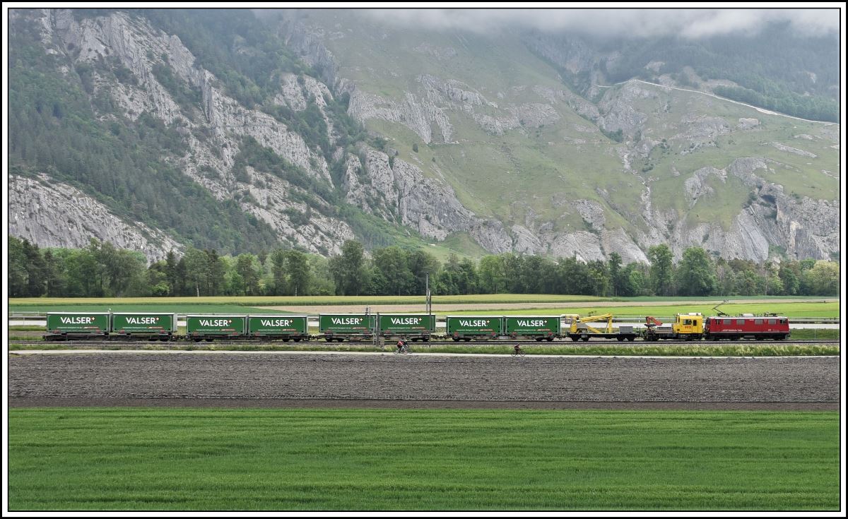 5757 mit der Ge 4/4 I 602 "Bernina" und neuen Wechselpritschen für Valserwasser auf dem Weg nach Ilanz bei Trin. (16.06.2020)
