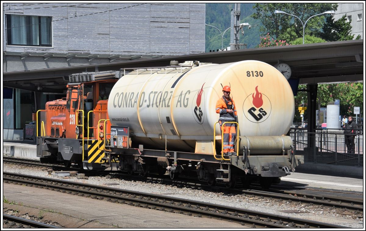 5737 mit Ge 4/4 I nach Ilanz mit zwei Heizoelzisternen, zwei Wagen mit leeren Abfallcontainern und vier Wagen mit acht Valser Wechselpritschen. (18.06.2020)