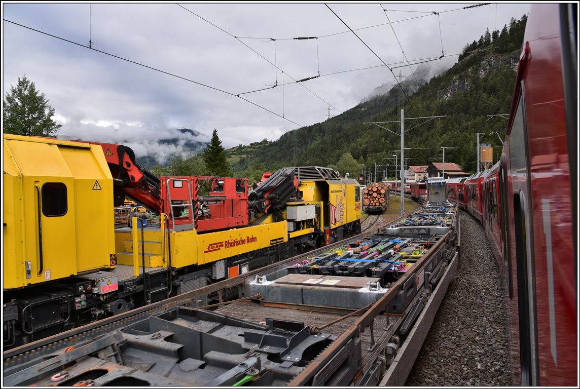 IR1121 ktreuzt in Surava Güterzug 5120 und Unterhaltsfahrzeug Xmf 6/6 24401. Die Pritschen mit den farbigen Bändern dienen zum Befestigen von Tübingen für den Bergünersteintunnel. (09.06.2020)