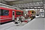 Der Spurpflug Xk 9143 wird an den soeben eingefahrenen Regio Tirano - St. Moritz rangiert für die Fahrt über den schneebedeckten Berninapass. Julian Ryf