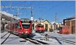 R1956 nach Scuol-Tarasp mit Ge 4/4 II 619 "Samedan", R4656 nach St.Moritz mit ABe 8/12 3502 und Spurpflug Xk9143 in Pontresina. (18.01.2019) Herbert Graf