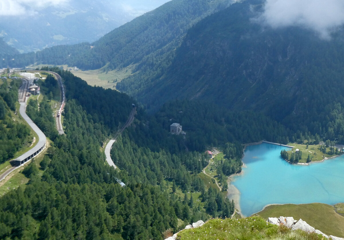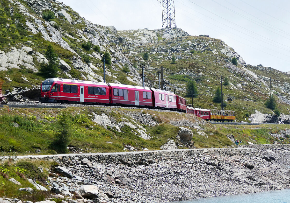 Der Zug fährt um den See: Regionalzug von St. Moritz nach Tirano in der Nähe der Station Ospizio Bernina (2253 müM). Ospizio Bernina, 7.8.2025