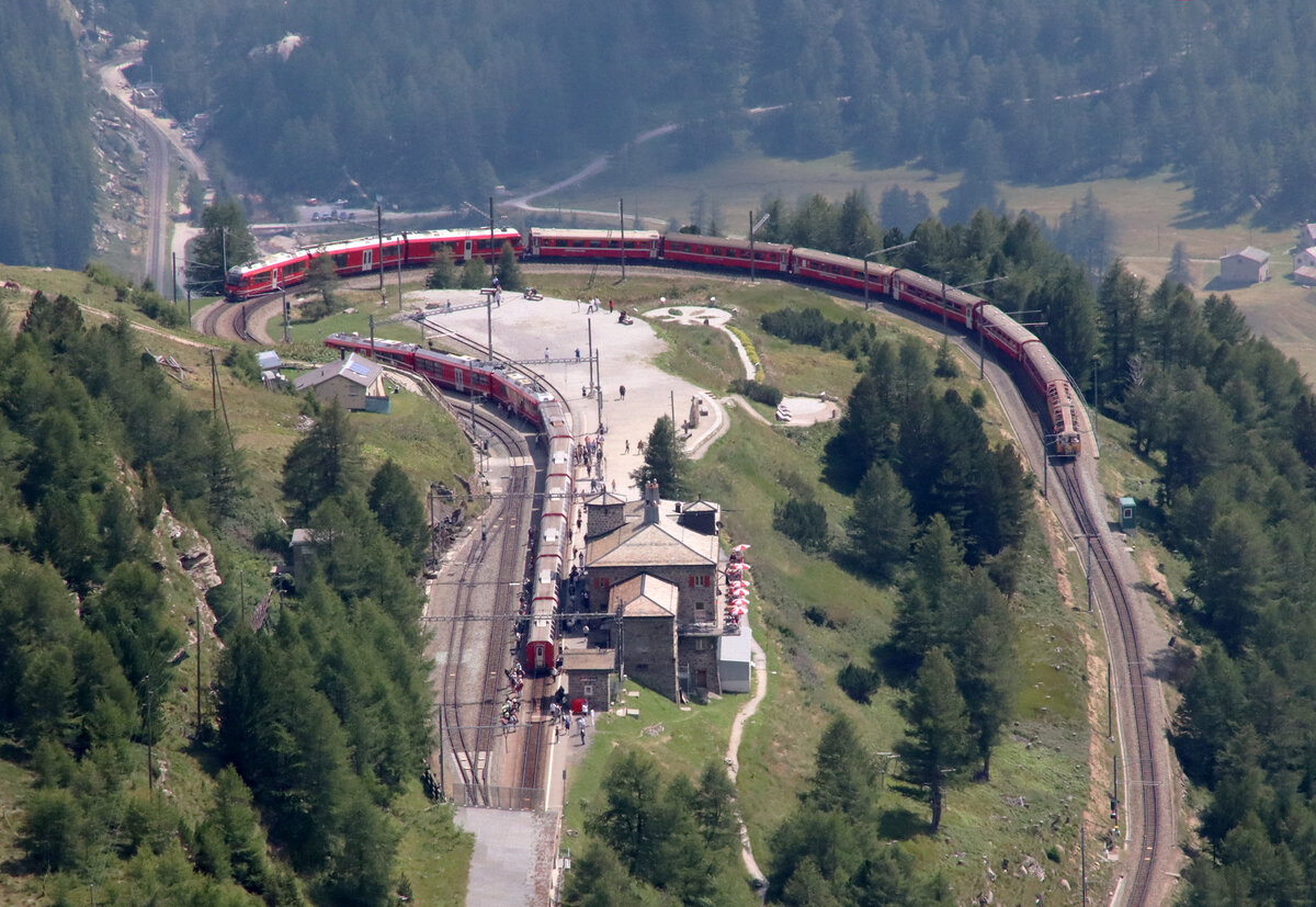 Kurz nach 14 Uhr, zwei Bahnhöfe auf einen Blick. In Alp Grüm (2091 müM) wartet der Bernina-Express St. Moritz - Tirano auf die Einfahrt des Gegenzuges. Links im Hintergrund ist die Station Cavaglia sichtbar. Das Foto wurde vom Aussichtspunkt Sassal Masone aus gemacht. Alp Grüm, 7.8.2025