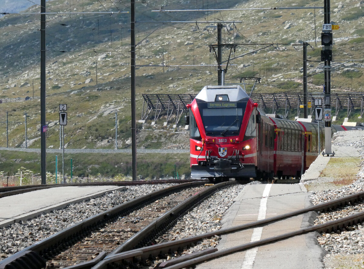 Um die Kurve und aufwärts: Triebzug Allegra 3512 fährt mit dem Bernina-Express Chur - Tirano in die Station Ospizio Bernina (2253 müM) ein. Ospizio Bernina, 7.8.2025