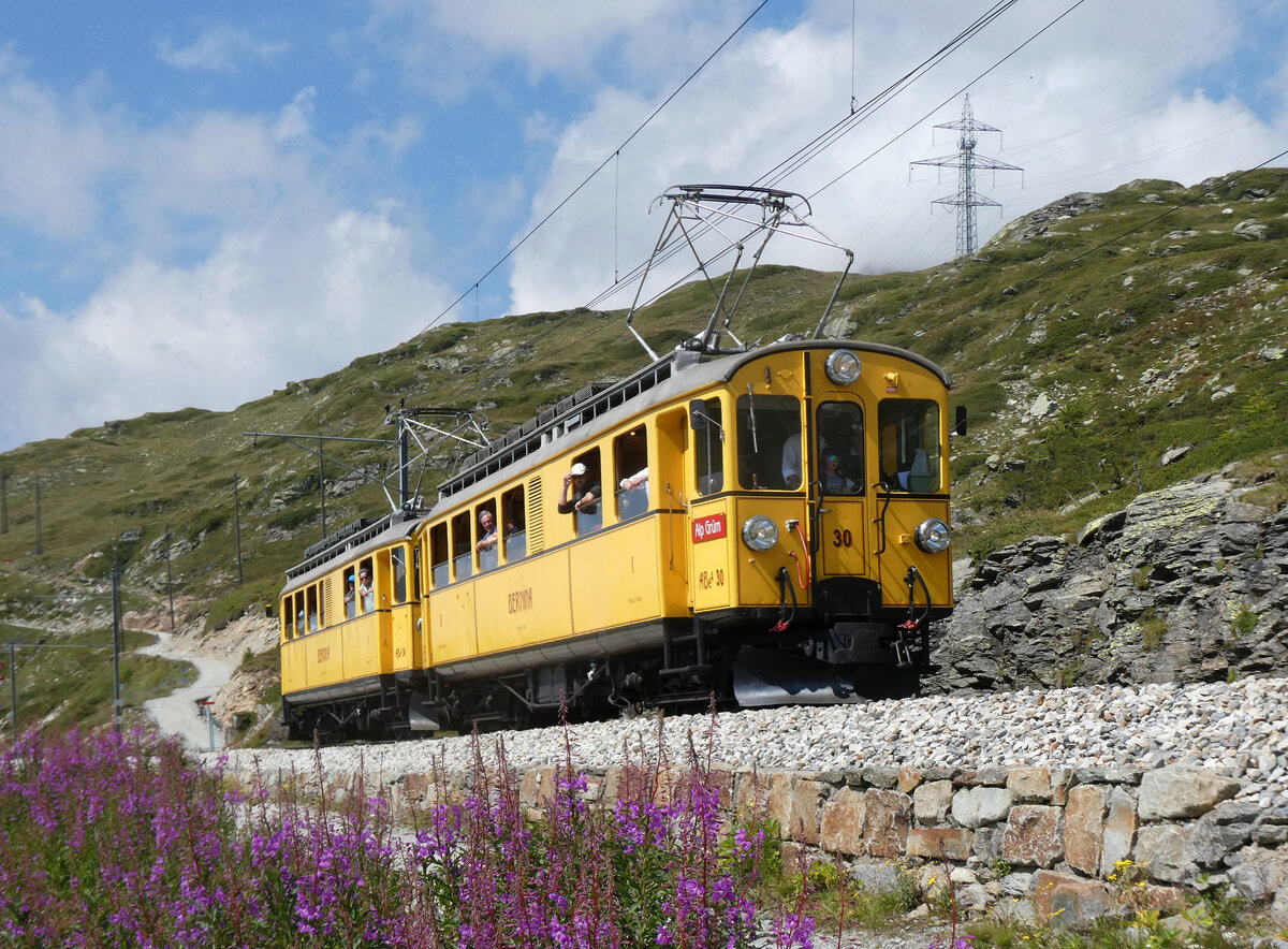Viel Freude bei den Bahnfans! In diesem Sommer verkehrten die beiden ABe 4/4 30 und 34 an ein paar Tagen über den Berninapass. Die über 100jährigen Triebwagen fuhren jeweils zweimal zwischen Alp Grüm und Pontresina hin und her. Es gab also mehrere Möglichkeiten mitzufahren und gute Fotos von verschiedenen Standorten zu schiessen. Dieses Foto wurde etwas ausserhalb der Station Ospizio Bernina (2253 müM) von einem Wanderweg aus gemacht. Ospizio Bernina, 7.8.2025