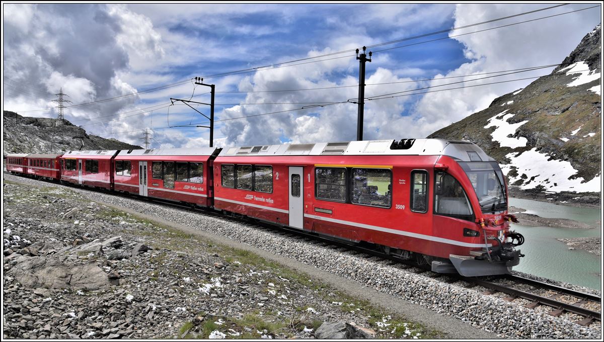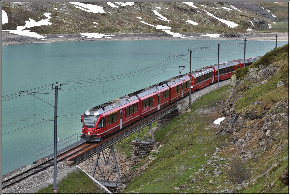 Der BerninaExpress fährt wieder, wenn auch erst sehr spärlich besetzt. PE951 mit ABe 8/12 3513 auf der Brücke am See gleich hinter Ospizio Bernina 2253m. (09.06.2020) Herbert Graf