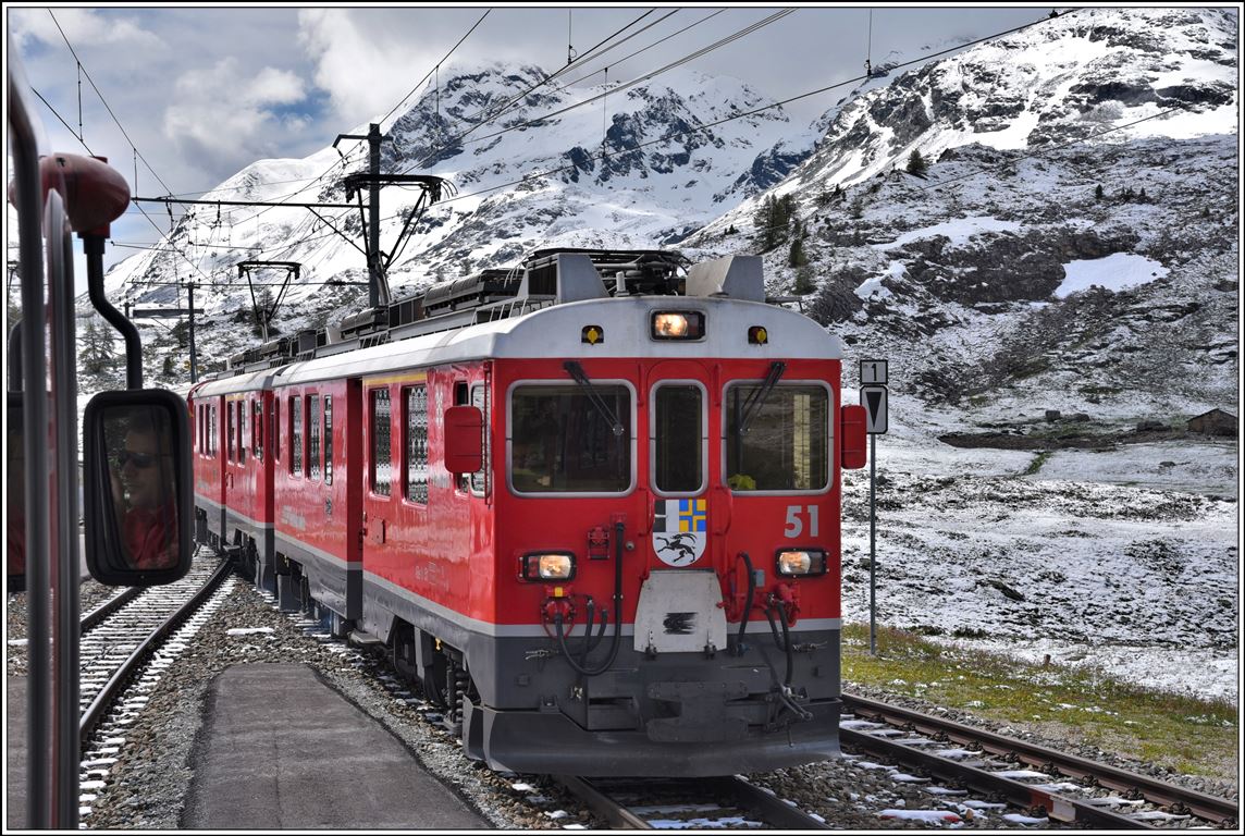 400m tiefer als Alp Grüm befindet sich die Station Cavaglia, wo sich soeben R1633 nach Campocologno mit ABe 8/12 3509 und R1652 nach St.Moritz mit ABe 8/12 3501 gekreuzt haben. (09.06.2020) Herbert Graf
